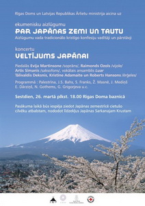 „Pēdējās dienās mūs visus ir aizsniegušas ziņas par Japānas traģēdiju, kas ir nodēvēta par lielāko traģēdiju tautas vēsturē kopš II pasaules kara. Vairāki desmiti tūkstoši bojā gājušo, milzīgs skaits to, kas palikuši bez pajumtes," pauž Rīgas Doma dekāns Elijs Godiņš. „Šāda traģēdija mūs neatstāj vienaldzīgus. Solidarizējoties ar Japānas zemi un tautu, Rīgas Doms aicina visus, kas vēlas paust savu atbalstu Japānas tautai, uz aizlūguma svētbrīdi un koncertu. Mēs nevaram būt vienaldzīgi un novērsties redzot, ka citi cieš. Mēs varam izteikt savu atbalstu ar savu klātbūtni, ar mūziku, ar lūgšanu." Aizlūguma svētbrīdi vadīs Latvijas Evaņģēliski luteriskās baznīcas bīskaps Guntars Dimants, Romas Katoļu baznīcas Latvijā Rīgas diecēzes arhibīskaps - metropolīts Zbigņevs Stankēvičs un citu konfesiju vadītāji un pārstāvji. Veltījuma koncertā uzstāties atsaukušies mūziķi no Latvijas Nacionālās operas, Latvijas Nacionālā simfoniskā orķestra un Jāzepa Vītola Latvijas Mūzikas akadēmijas. Koncertā piedalīsies Evija Martinsone /soprāns/, Raimonds Ozols /vijole/, Artis Sīmanis /saksofons/, vokālais ansamblis Luar, Tālivaldis Deksnis, Kristīne Adamaite un Roberts Hansons /ērģeles/. Programmā izskanēs Palestrīnas, J.S. Baha, S. Franka, Ž. Masnē, J. Mediņa, E. Dārziņa, N. Gothema, G. Grigorjevas un citu komponistu skaņdarbi. Pasākuma laikā būs iespēja ziedot Japānas zemestrīcē cietušo cilvēku atbalstam, nododot līdzekļus Japānas Sarkanajam Krustam. Lelb.lv |