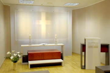 Tajā ir daži vienkārši soli, neliela mācītāja kancele un altāris, bet pie sienas pretī altāra krustam novietota organiskā stikla plāksne, uz kuras sīkiem burtiem var izlasīt visu Jauno Derību, ziņo LRKB Informācijas centrs. Kapelas iesvētīšanā piedalījās Latvijas lielāko draudžu mācītāji - Rīgas arhibīskaps - metropolīts Zbigņevs Stankevičs, kardināls Jānis Pujats, LELB arhibīskaps Jānis Vanags, Latvijas pareizticīgās baznīcas priesteris Jānis Dravants un Latvijas Baptistu draudžu savienības bīskaps Pēteris Sproģis.