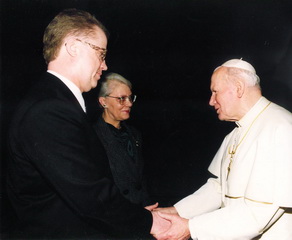 Tur izstādē „Pāvests Latvijā” apkopotas fotogrāfijas, kas tapušas Latvijas iedzīvotājiem personīgi tiekoties ar pāvestu Jāni Pāvilu II, un stāsti par to, kādu iespaidu šī satikšanās atstājusi viņu dzīvē, kā arī fotogrāfijas no Jāņa Pāvila II pastorālās vizītes Latvijā 1993. gada 8.-10. septembrī. Daudziem satikšanās ar Jāni Pāvilu II bijis ļoti nozīmīgs dzīves brīdis, par ko liecina šo mirkli iemūžinājusī fotogrāfija, kas mājās tiek turēta kā sava veida ģimenes relikvija. Aiz katras fotogrāfijas slēpjas savs dzīves stāsts un satikšanās „nospiedums" dvēselē. Izstāde mēģina šos nospiedumus kaut nedaudz atklāt... nospiedumus, kurus atstājušas tikšanās Rīgā, Aglonā, Romā, Vroclavā un citur. Izstādē apkopoti bīskapu Jāņa Pujata, Ārvalda Andreja Brumaņa, Vilhelma Lapeļa, Zbigņeva Stankeviča atmiņas un pārdomas, politiķu Gunta Ulmaņa, Georga Andrejeva, diplomātu Aijas Odiņas, Alberta Sarkaņa un Ata Sjanīša liecības, kā arī klostermāsu, priesteru, mūziķu, žurnālistu un daudzu citu, kopskaitā 40 cilvēku stāsti par tikšanos ar Jāni Pāvilu II. Savukārt Jāņa Pāvila II pastorālajai vizītei Latvijā veltītājā izstādes sadaļā apskatāmas fotogrāfijas, kas atspoguļo pāvesta viesošanos Rīgas Sv. Jēkaba katedrālē, ekumenisko tikšanos Rīgas Domā, tikšanos ar mācību spēkiem, studentiem un inteliģences pārstāvjiem Latvijas Universitātē, kā arī Jāņa Pāvila II svinētās Svētās Mises Mežaparkā un Aglonas svētnīcā. Aplūkojot šīs fotogrāfijas, varam kavēties atmiņās 1993. gada septembra ‘divās skaistajās un nozīmīgajās dienās – būtiskās mūsu valsts vēsturē un katram cilvēkam, kas caur pāvestu piedzīvoja Dieva pieskārienu. Izstādē apskatāmi fotogrāfu Aivara Liepiņa, Imanta Prēdeļa, Ilmāra Znotiņa darbi, fotogrāfijas no Vatikāna arhīva un kardināla Jāņa Pujata, Jura Vectirāna un citu izstādes dalībnieku personīgā arhīva. Foto: Gunta Ulmaņa kā toreizējā valsts prezidenta oficiālā vizīte Vatikānā 1994.g. LRKB IC |