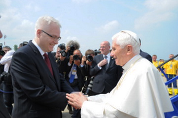 Ar Itālijas aviokompānijas Alitalia lidmašīnu A320 Benedikts XVI 4. jūnija priekšpusdienā ielidoja Zagrebā, kur viņu sagaidīja Horvātijas Republikas prezidents Ivo Josipovičs, Zagrebas arhibīskaps Josips Bozaničs, vietējās Bīskapu konferences prezidents arhib. Marins Srakičs, apustuliskais nuncijs Horvātijā arhib. Mario Roberto Kassari un citi valdības un Baznīcas pārstāvji. Pēc Vatikāna un Horvātijas himnu atskaņošanas un militārās goda parādes, uzrunu teica valsts prezidents Josipovičs. Viņš savas zemes katoļticīgo vārdā pauda prieku par pāvesta ierašanos un apliecināja, ka Svētajam Krēslam vienmēr ir bijusi noteicoša vēsturiska loma Horvātijas valsts dzīvē. Atgādināja, ka katolicisms lielākajai daļai Horvātijas iedzīvotāju ir būtisks nacionālās un kultūras identitātes elements.