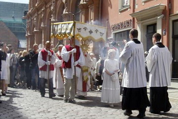 Kopš Latvijas neatkarības atgūšanas Rīgā šāds gājiens notika jau ceturto reizi. Vissvētākā Sakramenta procesija sākās plkst. 11.00 Pils laukumā pie Rīgas Sāpju Dievmātes baznīcas ar Svēto Misi. Pēc tam procesija ar Vissvētāko Sakramentu devās caur Doma laukumu ar apstāšanās vietām pie Rīgas svētā Jēkaba katedrāles un Rīgas svētās Marijas Magdalēnas baznīcas. Tā noslēdzās pie Sāpju Dievmātes baznīcas ar slavas un pateicības himnu "Te Deum" un svētību ar Vissvētāko Sakramentu. Viens no pasākuma organizētājiem, priesteris Ilmārs Tolstovs uzsvēra, ka procesija nebūtu jāuztver kā savdabīgs pikets, bet gan kā liecība par ticību Euharistiskajam Kristum. Ar vārdu „Euharistija" Romas Katoļu Baznīcā apzīmē Jēzus Kristus Miesu un Asinis, kas ir klātesošas Baznīcā zem maizes un vīna zīmēm. Baznīcā tiek iemiesoti Jaunajā Derībā lasāmie Jēzus vārdi: „Es esmu dzīvā maize, kas nākusi no debesīm. Ja kas ēdīs no šīs maizes, tas dzīvos mūžīgi." (Jn 6,51) Euharistiskās procesijas pirmsākumi meklējami viduslaikos. 13.gs. Beļģijā dzīvoja augustīniešu klostermāsa svētā Juliāna (Julienne de Mont-Cornillon), kurai Kungs Jēzus atklāja savu vēlēšanos, - lai Baznīcā tiktu svinēti Euharistijai veltīti svētki. 1246. gadā svētki pirmo reizi tika svinēti Ljēžas diecēzes ietvaros. Vēlāk pēc pārdabisku, ar Vissvētāko Sakramentu saistītu brīnumu piedzīvošanas, Pāvests Urbāns IV iedibināja visā Baznīcā Kristus Miesas un Asins svētkus, un uzticēja Akvīnas Tomam sacerēt tiem atbilstošu lūgšanu tekstus. Kristus Miesas un Asins svētki, kā arī tiem piederošā Euharistiskās procesijas tradīcija izplatījās visā Rietumeiropā un turpinājās apmēram 300 gadus. 1979.gadā to atjaunoja pāvests Jānis Pāvils II. Itālijā, Spānijā un citās Rietumeiropas valstīs svētki joprojām tiek plaši svinēti. Notiekot procesijai, pilsētu ielas un nami tiek rotāti ziediem, šādi parādot godu Pestītājam. Šādas procesijas Rīgas ielās notika jau Latvijas pirmās Republikas laikā. Pašu pirmo Euharistisko procesiju no svētā Jēkaba katedrāles līdz svētā Franciska baznīcai vadīja ievērojamais Latvijas sabiedriskais un valsts darbinieks bīskaps Jāzeps Rancāns. 2008. gadā tika rasta iespēja skaisto tradīciju atjaunot. LRKB IC Foto: A.Brikmanis |
