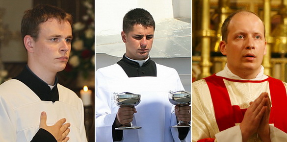 Edijs Silevičs par priesteri tiks ordinēts 2.jūnijā, pl. 11.00 Liepājas Sv. Jāzepa katedrālē, Andžejs Lapinskis un Bernards Vagalis – 3. jūnijā, pl. 12.00 Rēzeknes Jēzus Sirds katedrālē un Jurijs Gorbačevskis – 9. jūnijā, pl. 12.00 Jelgavas Bezvainīgās Jaunavas Marijas katedrālē. Topošais priesteris Edijs Silevičs (attēlā pa labi) ir kurzemnieks, viņa dzimtā puse – Ventspils novada Puzes pagasts. 2005. gadā Edijs Latvijas Universitātē ieguva bakalaura grādu bibliotēkzinātnēs. 2007. gadā, 26 gadu vecumā, jūtot aicinājumu uz priesterību, iestājās Rīgas Garīgajā seminārā. Studiju laikā pārliecinājās par to, ka izvēlētais ceļš ir īstais. Andžejs Lapinskis (attēlā pa kreisi) nāk no Daugavpils, no ticīgas ģimenes. Viņa vectēvs bija zakristiānis Daugavpils Sv. Pētera ķēdēs draudzē, un šajā draudzē arī Andžejs sācis piekalpot kā ministrants jau divarpus gadu vecumā. Kad mācījies Juzefa Pilsucka poļu skolā, jau 1. - 2. klasē sācis domāt par priesterību, arī sacerējumos skolā rakstījis, ka vēlas kļūt par priesteri. Vai šī vēlme radusies apkārtējās vides iespaidā? – „Ne gluži, es domāju, ka aicinājums ir iedots jau kopš dzimšanas, to ir grūti izskaidrot,” atzīst Andžejs Lapinskis. Topošais priesteris vēlas pateikties visiem, kas viņu atbalstījuši ceļā uz šo kalpošanu, īpaši priesterim Aleksandram Madelānam, Daugavpils sv. Pētera ķēdēs draudzes prāvestam. Bernards Vagalis (attēla vidū) ir dzimis Kombuļos un mācījies Sauleskalna pamatskolā. Vecāki jau no mazām bērnu dienām viņu pakāpeniski ievadīja draudzes dzīvē, ņemot līdzi uz baznīcu, līdz 11 gadu vecumā pats atradis savu vietu tajā kā ministrants. Bernards atceras Ziemassvētku vakaru, kad pirmo reizi piekalpojis Svētajā Misē Aglonas bazilikā. Sākumā piesaistījuši tērpi un liturģiskie dziedājumi, vēlāk – jau pamatskolas pēdējā klasē, tas pārauga domās par priesterību.Tā kā visu svētdienu un svētku dienu galvenā sastāvdaļa bija dievkalpojums, saprata, ka tas ir tas, ko vēlos darīt pats – kalpot Dievam un cilvēkiem! Jurijam Gorbačevskim dzimtā ir Dobeles Romas katoļu draudze. Pirms iestāšanās Rīgas Garīgajā seminārā Jurijs mācījās Banku Augstskolā, kur ieguva profesionālo maģistra grādu uzņēmējdarbības vadīšanas specialitātē. Aicinājuma atpazīšana Jurijam bijis meklējumu ceļš, un viņš ir pateicīgs Dievam par to, kā ticis vadīts. Savu turpmāko misiju viņš saredz kā kalpošanu ikvienam, kam nepieciešams Kristus, – vai tās būtu ģimenes, veci cilvēki, bērni, jaunieši, vai cilvēki, kas meklē savu aicinājumu dzīvē. „Es vēlos būt atvērts visiem, " saka Jurijs. „Es redzu, ka Dievs pats gatavo ceļu Evaņģēlija sludināšanai, cilvēki nemaz nav tik neticīgi, cilvēki ir ticīgi. Viņi tikai nezina, kā doties pie Dieva, nezina veidu, kā uzņemties uz sevi šo jūgu, kas patiesībā ir viegls. Nereti cilvēki nezināšanas dēļ nesaņem tās žēlastības, ko Dievs viņiem vēlas dāvāt."