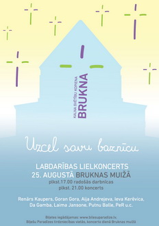 21.jūlijā Vecā Sv.Ģertrūdes baznīcā ar kora "Kamēr..." koncertu tika aizsākta vērienīga labdarības akcija "Uzcel savu baznīcu!". Tās mērķis ir atbalstīt un piesaistīt līdzekļus Svēto apustuļu kapelas celtniecībai un apustuļu skulptūru izveidei Bruknā. 25.augustā pulksten 21 Bruknas muižā notiks šīs akcijas turpinājums - lielkoncerts "Uzcel savu baznīcu!", kurā muzicēs un piedalīsies dažādi Latvijā zināmi un populāri mūziķi, tostarp, Renārs Kaupers, Goran Gora, Aija Andrejeva, Ieva Kerēvica, Da Gamba, koklētāja Laima Jansone, Putnu balle, PeR un citi. Savukārt pl.17.00 Bruknas muižas teritorijā sāksies radošās darbnīcas, kurās darbosies mākslinieces Elita un Ilze Patmalnieces, režisors Jānis Streičs, jurists Aivars Borovkovs, jaunais režisors Rūdolfs Mings un daudzi citi. Pasākuma laikā tiks demonstrēta filma "Kā tev klājas, Rūdolf Ming?" (režisors A. Rubīns). Akcijas organizatori dod iespēju apmeklētājiem izvēlēties sava ziedojuma, kas reizē kalpos kā ieejas biļete, vērtību. Biļešu cena - ziedojums - iespējams 3LVL; 5 LVL un 10 LVL vērtībā. Ziedojuma (ieejas biļetes) vērtība nenosaka sēdvietas atrašanās vietu pasākuma laikā. Ikviens apmeklētājs, neatkarīgi no summas, par kādu pirkta biļete, pats varēs izvēlēties savu koncerta skatīšanās vietu. Apmeklētāju ērtībai pasākuma organizatori aicina līdzi ņemt katram savu sedziņu sēdēšanai Bruknas muižas zālājā. Biļetes pieejamas "Biļešu Paradīze" kasēs un internetā www.bilesuparadize.lv, kā arī koncerta dienā Bruknas muižā. 2001.gadā izpostītajā Bruknas muižā priesteris Andrejs Mediņš Bauskas novadā izveidoja rehabilitācijas vietu "Kalna svētību kopiena". Tās mērķis ir palīdzēt dažādās atkarībās esošiem ļaudīm. Kopienā katram ir iespēja atrast pašam savu ceļu šai Dieva pasaulē, “lietojot” vienīgi garīgās dzīves un darba terapiju. Kopienas darbības struktūra ir izveidota pēc narkomānu kopienas “Senacolo” modeļa, kura atrodas Medžugorjē, Bosnijā-Hercogovinā, bet kopienas garīgā patronese ir Māte Terēza no Kalkutas. 2011.gada 31.maijā, Andreja Mediņa iniciēta, ir sākta baznīcas būve Bruknā, jo muižā esošā kapela ir par mazu. Lai būve taptu, nepieciešami ziedojumi. Akcijas "Uzcel savu baznīcu!" mērķis ir palīdzēt uzcelt sakrālo celtni. Iegādājoties biļetes uz labdarības koncertu "Uzcel savu baznīcu!", iespējams ziedot kapelas celtniecībai Bruknā. |