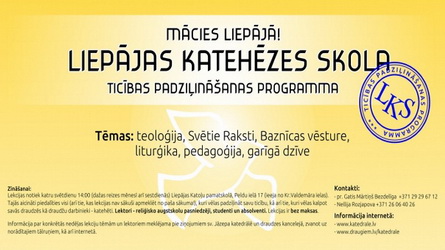 Skolas lektori ir Liepājas diecēzes priesteri un draudžu katehēti, kuriem ir bakalaura vai maģistra grāds teoloģijā. Piedalās arī uzaicinātie vieslektori. Lekcijas paredzētas visiem, kuri vēlas savās draudzēs kalpot kā katehēti, kā arī tiem, kas vēlas vienkārši padziļināt savas ticības zināšanas, pilnīgāk iepazīstot galvenās ticības patiesības jeb katehismu, kā arī apgūt Baznīcas vēsturi, liturģiku, morālteoloģiju, pedagoģiju, garīgo dzīvi un Svētos Rakstus. Aicināti arī citu konfesiju ticīgie. Katru svētdienu deviņu mēnešu garumā notiks divas lekcijas. Ar lekciju tēmām un lektoriem var iepazīties Pasākumu kalendārā mūsu portālā vai Liepājas Sv. Jāzepa katedrāles draudzes sludinājumu stendā. Ir iespējams apmeklēt atsevišķas lekcijas par interesējošām tēmām. Lekcijas notiek svētdienās Liepājas Katoļu pamatskolā 14.00 – 15.45 (ieeja no Kr. Valdemāra ielas puses). Katehēzes skola ir bez maksas. Informācija par studijām pa tālruni 29296712 (pr. Gatis Mārtiņš) vai e-pastu , 26078442 (Nellija). |