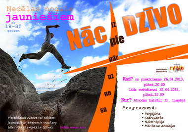 Daudz un dažādu iespēju DZĪVOŠANAI un Karostas iepazīšanai! Sestdien visas dienas garumā pārgājiens gar jūras piekrasti un blakus esošajiem mežiem ar dažādiem uzdevumiem un apstāšanās punktiem, bet pašā vakarā īpašs laiks kopā ar Jēzu nakts vigīlijā. Sākums 26. aprīlī pulksten 20, noslēgums – 28. aprīlī plkst. 15.00. Aicināti jaunieši vecumā no 18 - 30 gadiem. Dalības maksa 10Ls. Pieteikšanās: rakstot uz e-pastu vai zvanot pa tālr.: +371 26424324 (Elīna). |