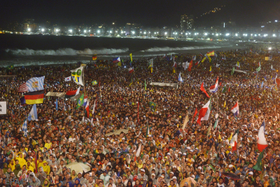 Jau vairākas stundas iepriekš puišu un meiteņu straumes plūda pludmales virzienā. No viņu mutēm skanēja vārdi: „Tā ir pāvesta jaunatne.” Kad parādījās automašīna ar pāvestu Francisku, viņu prieks un entuziasms eksplodēja. Svētais tēvs arī šoreiz apturēja auto, lai noskūpstītu un svētītu bērnus, un adresēja klātesošajiem uzmundrinājuma žestus. Ar kādu jaunieti viņš apmainījās baltajām cepurītēm, bet no kāda cita labprāt paņēma un padzērās savu iecienīto „Mate” – tradicionālo argentīniešu dzērienu.