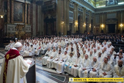 Runājot par svēto Pēteri Faberu, Francisks teica, ka viņš bija pilnībā centrēts uz Dievu, un tāpēc paklausības garā varēja iet, bieži vien arī kājām, uz dažādām Eiropas vietām, lai ar visiem veiktu maiguma pilnu dialogu un sludinātu Evaņģēliju. Pāvests domās pakavējās arī pie kārdinājuma savienot Evaņģēlija sludināšanu ar inkvizitoriskiem nosodījuma pērieniem. „Nē, Evaņģēlijs ir jāsludina ar maigumu, ar brālīgumu, ar mīlestību!” uzsvēra Francisks. Viņš atgādināja, ka Dieva pazīšana svētajam Pēterim Faberam ļāva saprast, ka iekšējā pieredze un apustuliskā dzīve iet roku rokā. „Tikai centrējoties Dievā, iespējams iet uz pasaules malām!” atkal uzsvēra pāvests. Viņš pieminēja, ka Fabers bez apstājas ceļoja arī līdz ģeogrāfiskajām robežām. Viņu plosīja intensīva vēlēšanās sludināt Kungu. „Ja šādas vēlēšanās mums nav, tad ir jāpakavējas lūgšanā un ar klusu dedzīgumu jālūdz Kungam, lai Viņš ar mūsu brāļa, svētā Pētera aizbildniecību, atgriežas un mūs savaldzina atkal,” teica pāvests-jezuīts saviem ordeņa biedriem.