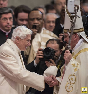 Ar lielas pazemības žestu, viņš noņēma apaļo cepurīti sasveicināšanās brīdī ar pašreizējo pāvestu. Gredzena pasniegšana, biretes uzlikšana, titula pasniegšana – pāvests Francisks atkārtoja šos vienkāršos žestus, kas Baznīcas 2000 gadu vēsturē notikuši ikreiz, ieceļot jaunus kardinālus. Taču šiem žestiem vienmēr ir jauns spēks, tie simbolizē kopību ar Romas bīskapu un pārējiem brāļiem kardināliem. Tieši šīs kristīgās mīlestības saites pieminēja jaunais kardināls Pjetro Parolins, kas pārējo jauno kardinālu vārdā sveica pāvestu Francisku un emeritēto pāvestu Benediktu XVI. Vatikāna valsts sekretārs atcerējās pāvesta Franciska aicinājumu viņa pontifikāta pirmajā dienā, proti, staigāt Kunga priekšā un celt Baznīcu. Šim tematam bija veltīta arī Svētā tēva homīlija.
