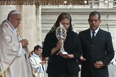 Kanonizāciju svinību laikā Floribeta Mora Diaza (1963) nesa svētā Jāņa Pāvila II relikvijas (attēlā). Savukārt māsa Mērija Simona Pjēra, kura tika izdziedināta no Parkinsona slimības, lasīja ticīgo lūgšanu franču valodā. Svētā Jāņa XXIII relikvijas nesa četri viņa ģimenes locekļi un pilsētas Sotto il Monte mērs Eudženio Boloņini, kurš ir arī Jāņa XXIII vārdā nosauktā fonda direktors. Radiovaticana.va Foto: Ekrānuzņēmums no video |