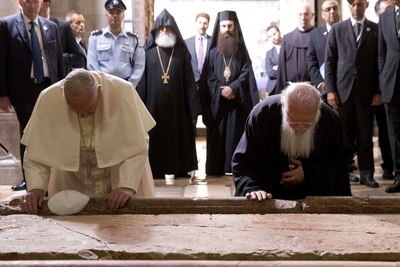 Pēc kopīgās deklarācijas parakstīšanas Francisks un Bartolomejs I devās uz Kristus kapa baziliku. Ekumeniskā dievkalpojuma laikā pāvests aicināja, lai neļaujam sev atņemt to, kas ir mūsu cerības pamats. „Neliegsim pasaulei dzirdēt priecīgo Augšāmcelšanās vēsti!,” viņš sacīja. „Nebūsim arī kurli uzstājīgajam aicinājumam pēc vienotības, kas atskan tieši no šīs vietas tā vārdos, kurš, būdams augšāmcēlies, visus mūs sauc par saviem brāļiem”. Svētais tēvs uzsvēra, ka mēs visi esam nevis nāves, bet augšāmcelšanās vīrieši un sievietes. Viņš atzina, ka domstarpības joprojām pastāv, taču tām nevajadzētu mūs izbiedēt un traucēt iet aizvien tālāk uz priekšu. Mums jātic, ka tāpat kā no Kristus kapa tika novelts akmens, tāpat arī var tikt novērsti visi šķērsli, kas pagaidām neļauj sasniegt pilnīgu savstarpēju vienotību. Radiovaticana.va Foto: News.va |
