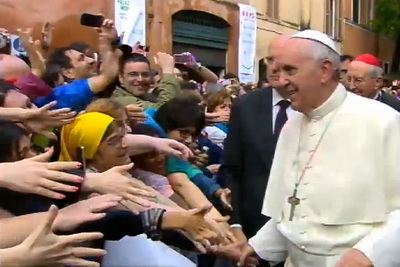 Ienākot dievnamā, Svētais tēvs bīdi lūdzās „Žēlsirdības Dievmātes” svētgleznas priekšā. Tā ir 7. gadsimta ikona, senākā koka ikona Romā, kur attēlota Dievmāte ar Jēzus Bērnu klēpī. Pirms pāvesta uzrunas uzstājās Svētā Egīdija kopienas dibinātājs Andrea Rikkardi, sīru-pareizticīgo arhibīskaps Žans Kavaks no Damaskas, 90 gadus vecā sirmgalve Irma Lombardo, 12 gadus jaunā meitene Frančeska Gregori, 28 gadus jaunais bezdarbnieks Daniels Kotani, 58 gadus vecā Adriana Čičiliani, kura ir invalīde jau no dzimšanas, 30 gadus vecais čigāns Branko Savics un 29 gadus vecais bēglis Davuds Jusefi.