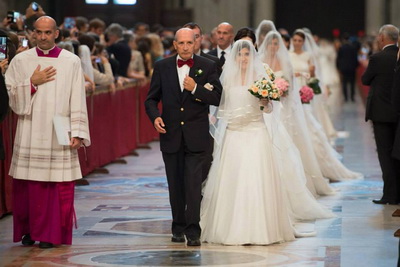 Viņi pāvesta priekšā teica viens otram skaidru „jā” vārdu. Daži pāri bija jaunāki par 30 gadiem (jaunākajai līgavai bija 25 gadi), citi jau ap 50 gadus veci (vecākajam līgavainim – 56). Kādas līgavas seju rotāja aizkustinājuma un prieka asaras. Katrs jutās pacilāts, īpaši brīdī, kad dzirdēja no Svētā tēva mutes savu vārdu. Laulība nav fikcija – sacīja Francisks. Tas ir kopīgs ceļš, kas nav viegls, bet ir skaists ceļš. Šajā ceļā vīra uzdevums ir palīdzēt savai sievai pilnveidoties kā sievietei un sievas uzdevums – palīdzēt savam vīram kļūt aizvien vīrišķīgākam.