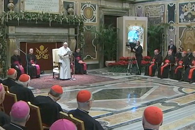 Tikšanās bija arī izdevība pakavēties pie aizvadītā gada svarīgākajiem notikumiem, atskatīties uz paveikto un stiprināt cerību nākotnei. "Kūrija ir aicināta būt aizvien labākai, aicināta augt vienotībā, svētumā un gudrībā, lai spētu īstenot savu misiju. Kūriju, līdzīgi kā cilvēka miesu, skar arī dažādas slimības, kas traucē tās normālu darbību. Pāvests nosauca tās vārdā. Viena no "slimībām" ir uzskatīt sevi par "nemirstīgu" un "neaizvietojamu". Kūrijā sastopama arī tā sauktā "martalisma" (nāk no vārda Marta) slimība, kad daudzi iegrimst darbā, atstājot novārtā "labāko daļu" – sēdēt pie Jēzus kājām, proti, lūgties. Francisks runāja arī par gara un prāta "pārakmeņošanās" slimību. Tā skar tos, kuriem ir nocietināta sirds, tos, kuri ieļaunojas, zaudē iekšējo mieru un prieku.