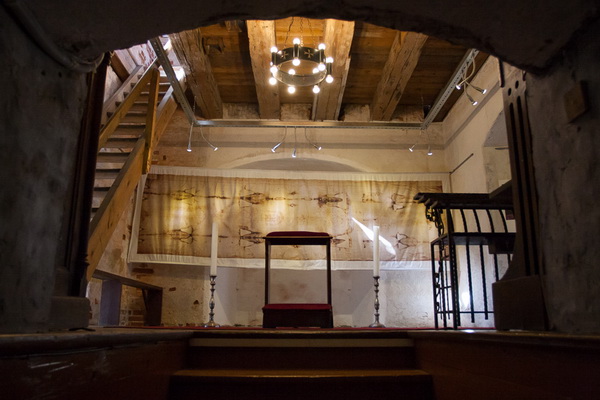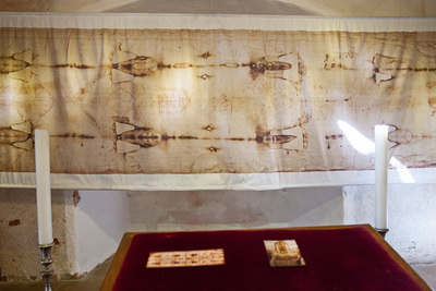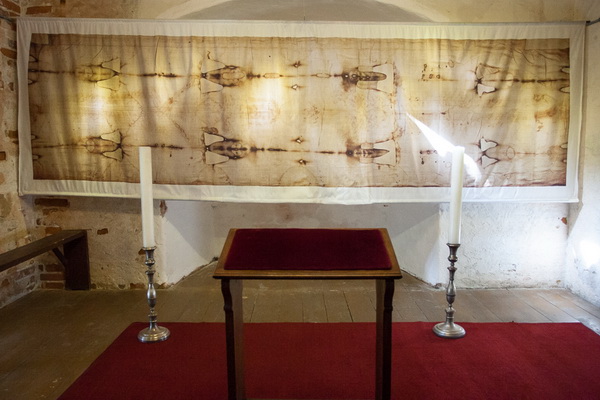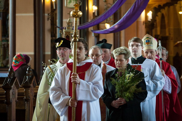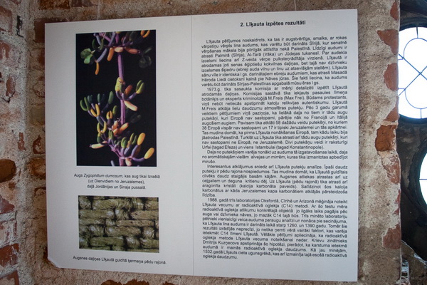 Vispirms viesi piedalījās procesijā un Svētajā Misē plkst. 11:00, kuru celebrēja Liepājas diecēzes bīskaps V.E. Viktors Stulpins. Savā uzrunā bīskaps pievērsa klausītāju uzmanību pūļa psiholoģijas fenomenam – Jēzum iejājot Jeruzalemē, cilvēki Viņu sveic ar palmu zariem, klāj Viņa ceļā drēbes, bet pēc dažām dienām tie paši cilvēki pieprasīs Jēzus nāvi – pūļa noskaņojums, cilvēku un apstākļu ietekmēts, būs mainījies. Bīskapa teiktais ļauj labāk izprast arī mūsu dienās notiekošās manipulācijas ar cilvēku masām un būt uzmanīgiem, lai neiekļūtu šajā plašsaziņas līdzekļu, sabiedriskās domas un citu apstākļu radītajā informācijas straumē, kas manipulē ar mūsu apziņu, nes projām no Dieva un paralizē Viņa doto brīvo gribu izšķirt lietas un pieņemt par tām Dieva gribā sakņotus spriedumus. Kā otru svarīgu momentu bīskaps minēja ciešanas un to jēgu, kas šodien ir īpaši aktuāli, jo mūsdienu cilvēks bēg no ciešanām, neredz tām jēgu, grib vadīt savas dienas komfortā un labsajūtā. Neviens nevēlas ciešanas ciešanu dēļ, uzsvēra bīskaps, un arī pats Jēzus tās neuzņēmās, tikai lai ciestu, bet, lai ciešanās kļūtu par pestīšanas gādnieku visām tautām un cilvēka ciešanas iegūst jēgu, iekļaujot tās Kristus ciešanās. Pēc Svētās Mises īsu uzrunu sacīja Ordeņa nodaļas Latvijā vadītājs Jānis Smelters, iepazīstinot draudzes locekļus ar nodaļas dibināšanas, kā arī izstādes tapšanas vēsturi. J.Smelters atcerējās, kā pirms 5 gadiem, lai materiāli par Turīnas līķautu, tā vēsturi un izpētes gaitu būtu pieejami pēc iespējas plašāk, Jeruzalemes Svētā Kapa Bruņinieku Ordeņa aizsācējs Latvijā Giorgio Ferrero par saviem līdzekļiem sagatavoja izstādē skatāmos materiālus un uzdāvināja tos Rīgas arhibīskapam – metropolītam V.E. Zbigņevam Stankevičam, lai tā kļūtu par ceļojošo izstādi Latvijas baznīcās. Ordeņa nodaļas vadītājs uzrunā minēja, ka izstādes materiālos var iepazīt autoritatīvu Itālijas zinātnieku slēdzienus, kas izdarīti pēc pamatīgas un ilgas līķauta izpētes, pielietojot gan kriminālistikas, gan vēl citu zinātņu metodes, pētot audumā atrodamos ziedputekšņus, dubļus, kas vēl palikuši tajā no mirušā kājām, auduma šķiedras, ķermeņa novietojumu, ievainojumus un to raksturu. Pētījuma gaitas apraksts tuvina skatītāju Cilvēkam, kas dzīvojis un staigājis Svētajā Zemē pirms 2000 gadiem, cietis, miris un bijis ietīts šajā miroņu autā, no kura pazudis neizskaidrojamā veidā. Izstādē redzamajos plakātos apkopoti sindoloģes, prof. Emanuelas Marinelli (Itālija), kā arī ENEA (Italian National agency for new technologies, Energy and sustainable economic development) vadošā pētnieka, prof. Paolo Di Ladzaro referātu materiāli, kuri tika nolasīti 2010.g. rudenī notikušajā konferencē “Svētā Līķauta noslēpuma izmeklēšana”. Zinātnieki nonākuši pie secinājuma, ka ar krusta nāvi izcietušā Cilvēka ķermeņa atveidojums nav radīts mākslīgi un mirušā ķermenis no Līķauta ir pazudis, to nesakustinot. Viesošanās noslēgumā viesi kopā ar bīskapu vēl pakavējās pie relikvijas kopijas katedrāles tornī un pēc nelielas kopīgas maltītes devās atceļā uz Rīgu. Uzlūkojot relikvijā iespiedušos, ne cilvēka rokām darināto sejas un ķermeņa atveidu, jāatzīst, ka tā ir īpaša dāvana – liecība par Kristus personu un Viņa ciešanu autentiskumu skeptiskiem cilvēkiem. Taču uznirst arī jautājums par cilvēka grēkā krišanas dziļumu – pat neņemot vērā faktu, ka mirušais bija Dieva Dēls, ir jāuzdod jautājums – ko cilvēks spēj nodarīt otram cilvēkam, savam brālim. Senajā, nodzeltējušajā audumā iespiestās zīmes runā arī par Dieva pazemības dziļumiem, par ko apustulis Pāvils sacījis: „Sevi iztukšoja, pieņemdams verga veidu, tapdams cilvēkiem līdzīgs” (Flp 2, 7)[1], kuros Dievs, kam pieder viss redzamais un neredzamais, nokāpa, lai atpestītu cilvēku no vissmagākās – grēka verdzības. Pēc Lieldienām ar Liepājas diecēzes bīskapa V.E. Viktora Stulpina svētību izstāde būs skatāma Liepājas Sv. Meinarda baznīcā un, ja kādās draudzēs ir piemērotas telpas un vēlēšanās izstādi uzņemt, ir iespēja rakstīt pieteikumu uz Jeruzalemes Svētā Kapa Bruņinieku Ordeņa Latvijas nodaļas e-pastu , lai varētu sastādīt grafiku. Izstāde Liepājas Svētā Jāzepa katedrālē skatāma līdz 6. aprīlim. [1] Bībeles tulkojumos latviešu valodā lasām „kalpa veidu”, kas nav precīzs tulkojums, grieķu vārds „δούλου” apzīmē vergu, pilnīgi beztiesīgu cilvēku. Vairāk skat. http://biblehub.com Stella Jurgena Foto: Katedrāle.lv