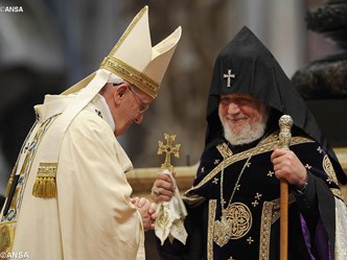 Svētdien, 12. aprīlī, Svētā Pētera bazilikā Francisks vadīja dievkalpojumu, pieminot armēņu tautas slaktiņu, kad pirms simts gadiem turki nogalināja pusotramiljona armēņu. Dievkalpojumā piedalījās vairāki simti armēņu rita ticīgo no Armērnijas un citām diasporas valstīm. Kopā ar pāvestu svēto Misi svinēja Armēnijas katoļu Baznīcas patriarhālās sinodes bīskapi. Klātesoši bija arī Armēnijas Republikas prezidents un valdības pārstāvji. Pieminot armēņu tautas traģēdiju, Svētais tēvs kārtējo reizi atgādināja, ka šobrīd norisinās „fragmentārais” trešais pasaules karš. „Katru dienu saņemam ziņas par nežēlīgām slepkavībām, asiņainiem slaktiņiem, iznīcības vājprātu,” – sacīja Svētais tēvs. Viņš uzsvēra, ka arī šodien turpinās sava veida genocīds, ko rada vispārējā vienaldzība, Kaina līdzvainīgā klusēšana, kurš saka: „Kāda mana daļa par to? Vai es esmu sava brāļa sargs?” „Pagājušajā gadsimtā cilvēce pārdzīvoja trīs milzīgas traģēdijas. Pirmā bija «vispāratzītais XX gadsimta genocīds» (Jāņa Pāvila II un Karekina II 2001. gada 27. septembrī Ečmiadzinā parakstītā deklarācija), kas skāra armēņu tautu – pirmo kristiešu tautu, skaidroja Francisks. Šajā slaktiņā tika nogalinātas arī asīriešu, kaldiešu un grieķu katoļu un pareizticīgo kopienas. Tika nogalināti bīskapi, priesteri, konsekretās personas, sievietes, vīrieši, vecie ļaudis, arī bērni un slimie, – sacīja pāvests. Pārējās traģēdijas īstenoja nacisms un staļinisms. Nesenā pagātnē masu slaktiņi veikti arī Kambodžā, Ruandā, Burundi un Bosnijā. Varam redzēt, ka tomēr pasaule nav spējīga apturēt asinsizliešanu.” Uzrunā Svētais tēvs norādīja, ka Otrā pasaules kara beigās dzimušais entuziasms šodien ir noplacis. Cilvēce nevēlas mācīties no savām kļūdām. Tāpēc arī šodien ir daudz tādu, kuri mēģina iznīcināt sev līdzīgos ar citu palīdzību vai līdzvainīgo klusēšanu. Mēs vēl neesam iemācījušies, ka „karš ir neprāts, bezjēdzīgs slaktiņš”, citējot pagājušā gada septembrī Redipuļjā teikto uzrunu, sacīja Francisks. Runājot par armēņu tautas traģēdiju, Svētais tēvs uzsvēra, ka ļaunuma noklusēšana un noslēpšana neļauj aizdzīt pagātnes brūcēm, tāpēc tās joprojām asiņo. „Ar ciešanu caurdurtu un cerības uz augšāmcēlušos Kungu piepildītu sirdi šodien atzīmējam šī traģiskā un prātam neaptveramā notikuma simto gadskārtu. Nedrīkstam aizmirst visus tos, kuri pieredzēja šīs šausmas. Tas ir mūsu pienākums, jo tur, kur izdziest atmiņa, nedzīst brūces,” piebilda Svētais tēvs. Sprediķī pāvests runāja arī par Dieva Žēlsirdības svētkiem, kurus pirms piecpadsmit gadiem ieviesa svētais Jānis Pāvils II. Francisks skaidroja, ka Kristus šodien ar evaņģēlija starpniecību rāda savas brūces. „Tās ir žēlsirdības brūces. Tā ir patiesība, ka Jēzus brūces ir žēlsirdības brūces,” atgādināja pāvests. „Cilvēces vēstures traģisko notikumu priekšā nereti jūtamies samulsuši un jautājam «kāpēc?». Cilvēciskā nelietība pasaulē radījusi bezdibeņus, lielos tukšumus: tukšumus bez mīlestības, tukšumus bez labestības, tukšumus bez dzīvības. Mēs uzdodam sev jautājumu: kādā veidā varam aizpildīt šos bezdibeņus? Mums tas nav iespējams. Tikai Dievs var aizpildīt visus tukšumus, kādus ļaunums rada mūsu sirdīs un mūsu vēsturē. Jēzus, kurš tapa cilvēks un mira krusta nāvē, grēka bezdibeni piepilda ar savu bezgalīgo žēlsirdību.” Francisks uzsvēra, ka Dievs atvēra ceļu, lai cilvēks spētu iziet no ļaunuma un nāves verdzības. Šis ceļš ir krustā piesistais un augšāmceltais Jēzus, Viņa žēlsirdības pilnās brūces. „Svētie māca, ka pasaule izmainās sākot ar mūsu sirds atgriešanos, un tas notiek pateicoties Dieva žēlsirdībai. Tāpēc savu grēku un pasaules lielo traģēdiju priekšā mūsu sirdsapziņa ir satraukta, bet tā nav nomākta, jo domājam par Pestītaja brūcēm. Viņš bija ievainots mūsu grēku dēļ. Skatīdamies uz augšāmceltā Jēzus brūcēm kopā ar Baznīcu varam dziedāt: «Viņa žēlsirdība pastāv uz mūžiem». Ar šiem vārdiem, kas ir dziļi iespiesti mūsu sirdīs, veiksim savas dzīves ceļu kopā ar savu Kungu un Pestītāju, kas ir mūsu dzīvība un mūsu cerība”, aicināja pāvests. Armēņu tautas slaktiņa piemiņas dievkalpojums noslēdzās ar lūgšanu par šīs tautas mocekļiem. Cilīcijas armēņu patriarhs Nerses Bedros XIX Tarmouni aizlūdza par visiem mirušajiem, bet Armēnijas Apustuliskās Baznīcas vadītājs katolikoss Karekins II lūdza pestīšanas žēlastību un uzņemšanu svēto pulkā pirms simts gadiem nogalinātos armēņu mocekļus. Svētās Mises laikā pāvests pasludināja svēto Gregoru no Narekas par Baznīcas doktoru. Armēņu mūks dzīvoja desmitajā gadsimtā Narekā, kas šodien atrodas Turcijas austrumos. Viņš iestājās klosterī un kļuva par priesteri. Bija izcils Svēto Rakstu un Baznīcas tēvu mācības pazinējs. Sarakstījis daudzas teoloģiska satura grāmatas. Viņa reliģiskie dzejoļi tiek izmantoti Armēnijas katoļu Baznīcas lūgšanās. Gregors nomira vienpadsmitā gadsimta sākumā. Viņa kaps klostera dārzā bija svētceļojumu mērķis līdz pat turku veiktajam slaktiņam pirms simts gadiem. Viņš ir viens no populārākajiem un visbiežāk citētajiem armēņu svētajiem. Svētdienas vakarā Romas Svētā Nikola no Tolentino baznīcai blakus esošajā Armēņu kolēģijā notika koncerts. Tajā uzstājās divi kori. Koncerta noslēgumā uzrunu teica Austrumu Baznīcu kongregācijas prefekts kardināls Leonardo Sandri. Radiovaticana.va Foto: News.va |