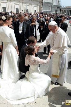 Tas ir drosmīgs solis. Laulība ir sākums jaunai kopienai, ģimenes kopienai. Laulātie ir aicināti nesavtīgi mīlēt un cienīt viens otru, un dāvāt sevi viens otram. Francisks norādīja, ka kristīgajai laulībai ir arī misionāra dimensija. Baznīcai ir vajadzīgi drosmīgi ticības liecinieki. Saskaņā ar sv. Pāvila mācību, mīlestība starp laulātajiem ir mīlestības starp Kristu un Baznīcu attēls – katehēzes mācībā sacīja Francisks. Apustulis tādējādi izceļ laulības noslēpuma lielumu. Runājot par jauno dzīvi Kristū, viņš arī norāda, ka visi kristieši ir aicināti mīlēt viens otru tā, kā Kristus viņus ir mīlējis, tas ir, visi ir aicināti cits citam kalpot (sal. Ef 5, 21). Kas attiecas tieši uz laulātajiem, vīram jāmīl sieva „kā sava miesa” (Ef 5, 28). Viņam jāmīl tā, kā Kristus „mīlēja savu Baznīcu un atdeva par to pats sevi” (5, 25). „Bet vai jūs, vīri, kas esat šeit, to saprotat?” – jautāja pāvests. „Mīlēt savu sievu tāpat kā Kristus mīl Baznīcu. Tie nav joki! Tas ir nopietni!” Tātad, laulātie ir aicināti mīlestībā un cieņā veltīt sevi viens otra labā, un tas atstāj milzīgu iespaidu uz visu kristīgo kopienu – norādīja Svētais tēvs. Turpinot uzrunu, Francisks atgādināja, ka Laulības sakraments ir liels ticības un mīlestības akts. Tā pieņemšana liecina par drosmi ticēt Dieva radošā akta skaistumam un izdzīvot to mīlestību, kas nemitīgi liek doties aizvien tālāk – aiz sevis un pat ārpus savas ģimenes. Šajā kontekstā pāvests arī norādīja, ka laulības pamatā ir vīrieša un sievietes brīvprātīgā piekrišana. Viņi ir aicināti uz nesavtīgu un neierobežotu mīlestību. Katra kristīgā laulātā pāra mīlestības vēsturē iesaistās arī visa Baznīca. Tā priecājas par laulāto panākumiem un tai rūp viņu neveiksmes. Šeit Svētais tēvs aicināja katru ticīgo uzdot sev jautājumu: Vai man patiesi rūp katra laulātā pāra un ģimenes liktenis? Vai esmu gatavs uzņemties atbildību par to, lai katrs laulātais pāris ietu pa mīlestības ceļu – tās mīlestības, ar kādu Kristus mīl savu Baznīcu, ceļu? Vīrieša un sievietes mīlestība līdzinās Kristus un Baznīcas mīlestībai. Protams, tas ir nepilnīgs salīdzinājums, tomēr esam aicināti saskatīt tajā apslēpto garīgo jēgu, kas ir ļoti dziļa un revolucionāra, bet vienlaikus vienkārša un pieejama katram, kas uzticas Dieva žēlastībai. Pirmkārt, laulība ir cēls noslēpums, otrkārt, tai piemīt arī misionāra dimensija – norādīja pāvests. „Tik tiešām, kristīgie laulātie draugi kā laulātie ņem dalību Baznīcas misijā. Tam vajadzīga drosme, vai ne! Tāpēc, sveicinot jaunlaulātos, es parasti saku: Lūk, drosmīgie! Patiešām, lai mīlētu tā, kā Kristus mīl Baznīcu, ir vajadzīga drosme”. Svētais tēvs atgādināja, ka laulātie draugi ir līdzatbildīgi par Baznīcas lielo mīlestības misiju. Katru reizi, kad tiek noslēgta šī laulības derība, Baznīca bagātinās skaistumā, tāpat tā kļūst nabadzīgāka katrreiz, kad šī derība tiek izkropļota. Lai atklātu visiem cilvēkiem ticības, cerības un mīlestības dāvanu, Baznīcai ir vajadzīga laulāto drosmes pilnā uzticība. Tā ir iespējama, pateicoties Laulības sakramenta žēlastībai. Neskatoties uz grūtībām, šī uzticība ir iespējama. Pateicoties žēlastībai, laulātie ir spējīgi mīlēt tā, kā mīl Dievs. Jāapzinās, ka Kristus nemitējas rūpēties par savu Baznīcu. Viņš to nemitīgi mīl un gādā par to. Katehēzes noslēgumā Francisks uzsvēra, ka drosmīgie laulātie ir liels potenciāls visai Baznīcai un pasaulei. Uzrunājot atsevišķas svētceļnieku grupas, pāvests aicināja ticīgos šajā maija mēnesī no jauna apliecināt savu mīlestību Dievmātei un pavadīt kopā ar viņu mazliet vairāk laika. „Paļāvīgi uzticiet viņai visus savus nodomus!” mudināja Svētais tēvs, sveicot franču ticīgos. Vispārējās audiences noslēgumā pāvests vērsās pie visas pasaules sabiedrības ar speciālu aicinājumu. „Tuvākajās dienās dažās galvaspilsētās tiks atzīmēta Otrā Pasaules kara beigu Eiropā 70. gadskārta,” viņš sacīja. „Šajā sakarā, caur Dievmātes – Miera Karalienes aizbildniecību, novēlu, lai cilvēce mācītos no pagātnes kļūdām. Lai, ņemot vērā mūsdienu konfliktus, kas plosa dažus pasaules apgabalus, visi laicīgie atbildīgie iesaistītos kopējā labuma meklēšanā un miera kultūras veicināšanā”. Radiovaticana.va Foto: News.va |