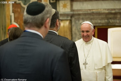 Svētais tēvs pauda prieku, ka šogad saiets notiek Romā, kur ir apbedīti apustuļi Pēteris un Pāvils. Šie apustuļi gan kristiešiem, gan arī ebrejiem ir svarīgs atskaites punkts. Viņi ir Baznīcas kolonnas. Bez tam, tieši Romā ir Rietumeiropas senākā ebreju kopiena. Tās aizsākumi meklējami Makabeju laikos. Abu reliģiju ticīgie dzīvo Romā cits citam līdzās jau gandrīz 2000 gadu, kas, protams, nenozīmē, ka šajā laikā viņu starpā nav bijis spriedzes. Francisks norādīja, ka patiesi brālīgs dialogs sāka veidoties pēc Vatikāna II koncila deklarācijas Nostra aetate izdošanas. Šis dokuments ir galīgs „jā” kristietības ebrejiskajām saknēm un neatsaucams „nē” antisemītismam. Šogad aprit 50 gadi kopš deklarācijas iznākšanas. Visiem kristiešiem ir ebrejiskās saknes – turpinot uzrunu, uzsvēra pāvests. Viņš norādīja, ka kristiešu vienotība slēpjas Kristū, bet ebreju – Torā. Kristieši tic, ka Jēzus Kristus ir Dieva Vārds, kurš šajā pasaulē tapa Miesa, bet, saskaņā ar ebrejiem, Dieva Vārds ir sevišķi klātesošs Torā. Abu reliģiju pamatā ir ticība uz vienu Dievu, uz Derības Dievu, kurš atklājas cilvēkiem caur savu Vārdu. Runājot par to, kāda ir cilvēka pareizā stāja pret Dievu, Francisks paskaidroja, ka kristieši vēršas pie Kristus, kurš ir jaunās dzīves avots, bet ebreji – pie Toras mācības. Svētais tēvs norādīja, ka šīs teoloģiskās pārdomas par kristiešu un ebreju attiecībām balstās tieši uz Vatikāna II koncila deklarāciju Nostra aetate (sal. n. 4). Tas ir stingrs pamats, uz kura varam arī turpmāk balstīt savstarpējo dialogu – viņš piebilda. Radiovaticana.va |