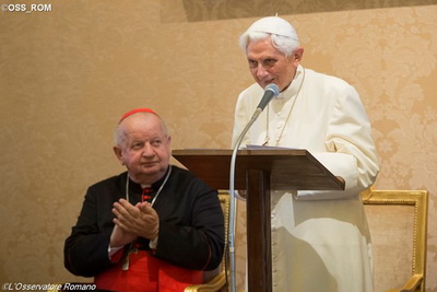 Titula piešķiršanas ceremonija notika Kastelgandolfo, kur viņš šobrīd uzturas. 4. jūlija rītā šeit bija ieradies Krakovas arhibīskaps Staņislavs Dzivišs un abu mācību iestāžu vadītāji, lai izteiktu atzinību par Benedikta XVI pontifikātu, lielo mācības mantojumu, kā arī mīlestību, ar kādu viņš attiecās pret šo pilsētu. 2006. gada 28. maijā Benedikts XVI teica: „Krakova ir Karola Vojtilas, Krakova ir Jāņa Pāvila II un Krakova ir arī mana”. Kardināls Dzivišs uzrunā pieminēja Benedikta XVI un Jāņa Pāvila II ciešo sadarbību un izteica pārliecību, ka Jānis Pāvils II šai brīdī raugās no debesīm un priecājas par šo tikšanos Kastelgandolfo. Emeritētais pāvests pateicās Krakovas Jāņa Pāvila II universitātei un Mūzikas akadēmijai par lielo atzinību un apliecināja prieku, ka viņa saikne ar Poliju, ar Krakovu tādējādi ir kļuvusi vēl ciešāka. Benedikts XVI teica, ka ar savu piemēru svētais Jānis Pāvils II ir pierādījis, ka roku rokā var iet sakrālās mūzikas lielais prieks un dalība svētajā liturģijā. Honoris Causa saņēmējs atcerējās, ka Zalcburgas apkārtnē, kur viņš izaudzis, svētku Mises pavadīja koris un orķestris. Jozefa Ratcingera atmiņā esot iespiedusies Mocarta Kronēšanas Mesa, kad šķitis, ka atveras debesis un tajās var izjust Kunga klātbūtni. Benedikts XVI pateicās korim un orķestrim, kas viņam ceremonijas laikā atskaņoja Mocarta skaņdarbus. Emeritētais pāvests jautāja „Kas ir mūzikas realitāte? No kurienes tā nāk un uz ko tiecas?" Viņš izcēla trīs „avotus”, no kuriem izriet mūzika: „Pirmais avots ir mīlestības pieredze. Kad cilvēkus pārņēma mīlestība, tiem pavērās cita būtības dimensija, jauns realitātes plašums. Un tā lika arī izpausties jaunā veidā. Poēzija, dziesma un mūzika būtībā ir dzimušas no šī pārsteiguma, no šīs jaunas dzīves dimensijas atvēršanās.” Otrs „avots”, no kura Benedikta XVI skatījumā izriet mūzika, ir skumju pieredze, nāve, sāpes un eksistences dziļā dzelme. Arī šai gadījumā notiek jaunu dimensiju atvēršanās, taču pretējā virzienā. Tās ir tādas realitātes dimensijas, kurās atbildi nevar rast vienīgi sarunās vien. „Visbeidzot, trešais mūzikas sākotnes „avots” ir tikšanās ar dievišķo,” teica emeritētais pāvests. Viņš norādīja, ka tas jau no iesākumiem veido daļu no tā, kas cilvēkam piešķir definīciju. Tas viņam liek meklēt arī jaunus izteiksmes veidus. „Varbūt ir iespējams apgalvot, ka arī mīlestības un nāves gadījumā mūs skar dievišķais noslēpums,” teica Benedikts XVI, „un būt Dieva skartiem – tas ir tas, kas veido mūzikas sākumus.” Emeritētais pāvests īpaši pieminēja Psalmus, kuros darbojas gan mīlestība, gan nāve, un nosauca tos par Dieva Baznīcas sakrālas mūzikas pirmsākumu. „Jo šķīstāka un patiesāka būs tikšanās ar dievišķo, tai skaitā ar mīlestību un nāvi, jo šķīstāka un cēlāka būs arī mūzika, kas izriet un attīstās no šīs pieredzes,” teica Krakovas Mūzikas akadēmijas Honoris Causa titula saņēmējs. Benedikts XVI pievērsās dažādu kultūru un reliģiju attiecībām caur literatūru, arhitektūru, tēlotājmākslu. Un visās kultūrās un reliģijās ir arī mūzika. Emeritētā pāvesta skatījumā nevienā no tām nav tik cēlas mūzikas, kā tā, kas ir dzimusi kristīgajā ticībā – no Palestrinas līdz Baham, līdz Hendelim un Mocartam, Bēthovenam un Brukneram. „Rietumu mūzika ir kaut kas unikāls, kurai nav līdzīgu citās kultūrās,” teica Benedikts XVI un piebilda, ka tas liek padomāt. „Protams, Rietumu mūzika plešas tālāk par reliģisko un ekleziālo vidi vien. Un tomēr, savu visdziļāko sākumu tā rod tikšanās ar Dievu liturģijā. Lielā un šķīstā Rietumu mūzikas atbilde ir attīstījusies, tiekoties ar to Dievu, kurš liturģijā ir klātesošs pie mums Jēzū Kristū. Manuprāt, šī mūzika ir kristietības patiesības manifestācija. Tur, kur attīstās šāda atbilde, ir notikusi tikšanās ar patiesību, ar īsteno pasaules Radītāju.” Benedikts XVI sacīja, ka tāpēc lielā sakrālā mūzika ir teoloģiska ranga realitāte, kurai ir paliekoša nozīme visas kristietības ticībā, lai arī nav nepieciešams, ka tā būtu jāizpilda vienmēr un visur. „No otras puses,” teica emeritētais Baznīcas gans, „ir skaidrs, ka tā nedrīkst pazust no liturģijas un ka tās klātbūtnei ir jābūt īpašam veidam, lai piedalītos sakrālajās svinībās, ticības noslēpumā.” Benedikts XVI vēlreiz pateicās goda doktora Honoris Causa piešķīrējām – Krakovas Pontifiklajai Jāņa Pāvila II universitātei un Mūzikas akadēmijai, un teica, ka tas ir būtisks ieguldījums, lai lielā mūzikas dāvana, kas nāk no kristīgās ticības, turpina dzīvot un palīdz neizsīkt ticības radošajam spēkam arī nākotnē. Radiovaticana.va Foto: L'Osservatore Romano |