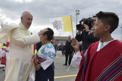 Viņu sagaidīja Baznīcas un civilas varas pārstāvji. Savu pirmo uzrunu pāvests teica vienā no lidostas paviljoniem, kur notika oficiālā sagaidīšanas ceremonija. Atgādinām, ka svētais Jānis Pāvils II Ekvadorā viesojās 1985. gadā no 30. janvāra līdz 1. februārim sakarā ar Dienvidamerikas evaņģelizācijas 450 gadu jubileju. Aptuveni trīspadsmit stundu ilgā lidojuma laikā Francisks sasveicinājās ar žurnālistiem, sakot: „Labdien! Novēlu jums labu ceļojumu un pateicos par jūsu darbu. Tas ir ļoti nozīmīgs darbs, jo sekojat vizītes norisei un visiem svarīgākajiem notikumiem. Pateicos jums! Pateicos par visu! Vēl tiksimies šajās astoņās dienās! Paldies!” Pāvesta Franciska „pirmais brīnums” ir dialoga atjaunošana valsts un Baznīcas starpā, – sacīja Ekvadoras pilnvarotais vēstnieks pie Svētā Krēsla Luīzs Latorre Tapija. Intervijā meksikāņu informācijas aģentūrai Notimex viņš uzsvēra, ka pāvestam ir izdevies pārliecināt gan prezidentu Rafaelu Korrea, gan bīskapus censties izlīgt un pārvarēt pagātnē radušās nesaskaņas. Lidostā „Mariscal Sucre”, apsveicot pāvestu ar ierašanos, prezidents Rafaels Korrea uzsvēra, ka Ekvadora ir zeme, kur tiek respektētas tiesības uz dzīvību no ieņemšanas brīža līdz pat dabiskai nāvei un kur tiek sargāta ģimenes institūcija. Viņš sacīja, ka pāvests ir morālā autoritāte gan ticīgajiem, gan neticīgajiem. „Esmu ieradies kā Dieva žēlsirdības un ticības Jēzum Kristum liecinieks,” atbildes uzrunā sacīja pāvests. Svētais tēvs aicināja ekvadoriešus pateikties Dievam par Viņa lielajiem darbiem, aicināja aizsargāt mazos un vājos, rūpēties par bērniem un veciem ļaudīm, uzticēties jaunatnei, novērtēt savas tautas cēlumu un priecāties par savas zemes skaistumu. Runājot par ekonomisko un sociālo situāciju, pāvests skaidroja, ka mūsdienu izaicinājumu un smago problēmu atrisinājuma atslēga ir „spēja ieklausīties citos, apņēmība veicināt dialogu un sniegt konkrētu ieguldījumu sabiedrības attīstībā.” Pēc sagaidīšanas ceremonijas Francisks ar automašīnu ieradās Kito apustuliskās nunciatūras mītnē, kur viņš uzturēsies savas vizītes laikā. Pirmdienas rītā Svētais tēvs ar lidmašīnu devās uz Gvajakilu – kultūras, finanšu un tirdzniecisko centru, kas atrodas 265 km no galvaspilsētas. Gvajakila ir pimā Ekvadoras pilsēta, kas pasludināja savu neatkarību no Spānijas. Pirms Euharistijas svinībās, kas notika pilsētas laukumā, pāvests apmeklēja jauno Dieva Žēlsirdības sanktuāriju. Tā izmēri ir iespaidīgi. Dievnama celtniecības darbi pabeigti 2013. gadā. Blakus esošajā autostāvvietā var novietot 120 automašīnas. Savukārt pašā dievnamā ir 2.300 sēdvietu. Pēc Svētās Mises pāvests dosies uz Ksavera kolēģiju, kur jezuīti viņam būs sagatavojuši garšīgas pusdienas. 1956. gadā izveidotajā „Unidad educatica Javier” centrā mācās 1560 jaunieši. Pulksten 18.00 (pulksten 2.00 pēc Latvijas laika) Francisks atgriezīsie Kito, kur viņam paredzēta tikšanās ar Ekvadoras prezidentu Rafaelu Korrea un Kito katedrāles apmeklējums. Savukārt 7. jūlijā Francisks tiksies ar bīskapiem, vadīs dievkalpojumu un apmeklēs Ekvadoras Katoļu universitāti. Radiovaticana.va Foto: L'Osservatore Romano Video:pāvests Francisks Ekvadorā - Svētā Mise Skatīties YouTube