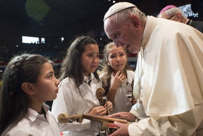 Savukārt, simtiem tūkstošu jauno cilvēku priekšā, kas piepildīja visu Paragvajas upes Kostanera pludmali, Francisks izvēlējās runāt bez iepriekš sastādīta teksta. Viņš norādīja uz trim apvāršņiem. Tie ir brīva sirds, kas nepadodas pasaules apmāniem, solidaritāte ar brāļiem un Jēzū salikta cerība. Runājot par sirds brīvību, pāvests uzsvēra, ka brīvība ir Dieva dāvana. Taču tā ir jāprot saņemt un sirds ir jāatbrīvo no daudzām saitēm, tādām ka izmantošana, iztikas līdzekļu trūkums, atkarība no narkotikām, no skumjām. To pateicis, Svētais tēvs aicināja kopā lūgties: „Kungs Jēzu, dod man brīvu sirdi, lai tā nav daudzo pasaules apmānu verdzene. Lai tā nav ērtību un pievilšanas verdzene. Lai tā nav „skaistās dzīves” verdzene. Lai tā nav netikumu verdzene. Lai tā nav viltotas brīvības verdzene, kas vēlas darīt to, kas man katrreiz iepatīkas!” Runājot par solidaritāti starp brāļiem, pāvests pievērsās Lizas, meitenes, kas sniedza liecību, vēsturei. Viņa kopj smagi slimās māti un vecomāti. Jauniete pastāstīja, ka sākumā viņa bijusi ļoti nesagatavota, bet vēlāk, pateicoties draugu solidaritātei, rada spēku iet uz priekšu. Pāvests sacīja, ka Lizas pieredze māca, ka nedrīkstam būt kā Poncijs Pilāts. Liza varēja uzticēt slimās sievietes aprūpes namam, un bez rūpēm dzīvot savu jauno dzīvi. Taču ar mīlestību viņa izpilda ceturto bausli – tev būs savu tēvu un māti godāt! „Tā ir augsta solidaritātes pakāpe, augsta mīlestības pakāpe,” teica Francisks. Trešais pāvesta norādītais apvārsnis – Jēzū salikta cerība. Šeit Svētais tēvs izcēla cita jaunieša – Manuela liecību. Puisis pirms tam stāstīja par savu smago bērnību, kas bija pilna vardarbības un izmantošanas. Tās viņu noveda līdz atkarībai no narkotikām. Taču Manuelu izglāba tikšanās ar Jēzu. Pāvests atzīmēja, ka izmisums daudzus jauniešus dzen pretim noziedzībai. Francisks aicināja šiem jauniešiem apliecināt, ka esam tiem tuvi un ka vēlamies viņiem palīdzēt ar mīlestību. Svētais tēvs visus rosināja lūgties: „Jēzu, lūdzu Tevi par puišiem un meitenēm, kuri nezina, ka Tu esi viņu spēks, par tiem, kuriem ir bail dzīvot, bail būt laimīgiem, bail sapņot. Jēzu, iemāci mūs sapņot – sapņot lielas lietas, skaistas lietas, lietas, kas var šķist ikdienišķas, bet kuras spēj paplašināt sirdi. Kungs Jēzu, dāvā mums spēku, dāvā brīvu sirdi, dāvā cerību, dāvā mīlestību un māci kalpot!” Jauniešiem iesniegtajā tekstā pāvests pasvītro, ka viena no vislielākajām dāvanām, kas cilvēkam var piederēt un ko viņš var dāvāt citiem, ir draudzība. Kamēr sātana stratēģija ir solīt daudz, bet nedot neko, Jēzus mums rāda citu ceļu. Viņš mums rāda ceļu, kas ir dzīvība un patiesība. Francisks atzīmēja, ka patiesā laime, kas piepilda sirdi, nav rodama dārgās drēbēs, ko ģērbjam mugurā, kurpēs, ko aujam kājās, pazīstama zīmola etiķetē. Patiesā laime ir būt iejūtīgiem, iemācīties raudāt ar tiem, kas raud, būt tuviem tiem, kas ir noskumuši, pasniegt roku, dāvāt apskāvienu. „Laimīgi ir tie, kas prot iejusties citu ādā, kas spēj apskaut un piedot,” sacīja pāvests Paragvajas jauniešiem. Radiovaticana.va Foto: L'Osservatore Romano |