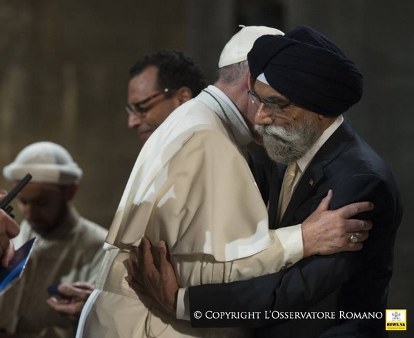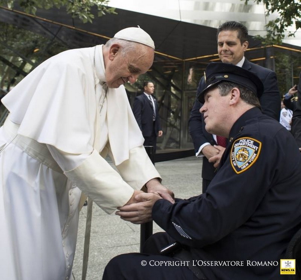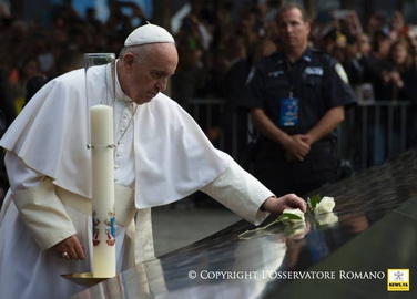Vēlāk viņš tikās ar terora akta upuru tuviniekiem. Vietā, kas traģiski iezīmēja XXI gadsimtu, piektdien pāvests tikās ar dažādu reliģiju pārstāvjiem. Klātesošo vārdā Romas bīskapu apsveica Ņujorkas ebreju kopienas rabīns Kosgrove un musulmaņu imams Latifs. Ebreju un musulmaņu kopienas vadītāji nosodīja pirms četrpadsmit gadiem veikto noziegumu. Tikšanās sākumā Francisks nolasīja 2008. gadā Ņujorkā pāvesta Benedikta XVI lūgšanu par mieru. «Miera Dievs, ienes mieru vardarbības pārņemtajā pasaulē, dāvā mieru visiem cilvēkiem un visām tautām. Atgriez uz mīlestības ceļa tos, kuru prātus un sirdis dedzina naids.» Par mieru lūdzās arī piecu reliģiju pārstāvji. Pēc rabīna nodziedātās lūgšanas par mirušajiem tikšanās dalībniekus uzrunāja pāvests. Svētais tēvs atzina, ka stāvot vietā, kur absurdā destrukcijas aktā gājuši bojā tūkstošiem cilvēku, sirdī rodas dažādas sajūtas un emocijas. Šī ir vieta, kur sāpes ir gandrīz sataustāmas. Pāvests norādīja uz Pasaules Tirdzniecības centrā izveidotā pieminekļa arhitektonisko nozīmi. «Ūdens, kas plūst uz tukšo dobumu, atgādina par tiem cilvēkiem, kuru dzīvības izdzēsa citi, uzskatot, ka iznīcināšana ir vienīgais konflikta atrisināšanas veids. Tas ir to cilvēku mēmais kliedziens, kuri kļuva par vardarbības, naida un atriebības loģikas upuriem. Šāda loģika var izraisīt tikai sāpes, ciešanas un asaras,» teica Francisks. «Plūstošais ūdens simbolizē arī mūsu asaras. Asaras par pagātnē un arī šodien veikto vardarbību. Tā ir vieta, kur plūst mūsu asaras, kur raudam no sāpēm, kas liek mums justies bezpalīdzīgiem netaisnības un brāļu slepkavības priekšā, nespējīgiem atrisināt domstarpības dialoga ceļā. Šajā vietā mēs apraudam daudzu nevainīgu cilvēku netaisnīgu un nepamatotu nāvi, kas bija saistīta ar nespēju rast atbilstošus risinājumus. Šis ūdens mums atgādina asaras, kas izlietas vakar un kas līst arī šodien,» sacīja Svētais tēvs. Vēršoties pie upuru tuviniekiem, pāvests uzsvēra, ka iznīcināšana nekad nav bezpersoniska, abstrakta vai tikai materiāla. Tai vienmēr ir seja, vārds un konkrēta vēsture. «Šeit, ciešanu un sēru vietā, varam sajust arī varonīgo labestību. Vissmagāko sāpju brīdī jūs bijāt liecinieki pašaizliedzībai un sevis ziedošanai citu labā. Metropolē, kas šķiet kā bezpersoniska un anonīma vieta, jūs atbalstījāt viens otru, izrādījāt mīlestību, steidzāties palīdzēt. Šajā brīdī neviens nedomāja par rasi, tautību, piederību kādai reliģijai vai politiskai partijai. Tas bija solidaritātes jautājums, neatliekama rīcība, brālība. Tas bija cilvēciskuma jautājums. Ņujorkas ugunsdzēsēji iegāja iedragātajās celtnēs, lai meklētu un glābtu cilvēkus, nepievēršot uzmanību sev. Daudzi aizgāja bojā, bet viņu upurēšanās daudziem ļāva izdzīvot,» sacīja Svētais tēvs. Turpinot uzrunu, Francisks uzsvēra, ka šī nāves vieta ir kļuvusi par dzīvības vietu. Tā ir dzīvības uzvaras pār nāvi un iznīcību vieta, labā uzvaras pār ļauno, izlīguma un vienotības uzvaras pār šķelšanos un naidu vieta. «Esmu pateicīgs, ka šajā skumju un atceres vietā varu pievienoties daudzu reliģisko tradīciju pārstāvjiem. Ceru, ka mūsu klātbūtne šeit ir skaidra zīme kopīgai velmei būt par izlīguma, miera un taisnīguma spēku šajā kopienā un visā pasaulē. Neskatoties uz atšķirībām un strīdiem, miers ir iespējams,» uzsvēra Svētais tēvs. Viņš aicināja izskaust no savām sirdīm naida un atriebības jūtas, kā arī lūgties par mieru mājās, ģimenēs, skolās, draudzēs, zemēs, kur notiek kari, lūgties par mieru visā pasaulē. Starpreliģiju tikšanās noslēdzās ar miera zīmi. Atvadījies no piecu reliģiju pārstāvjiem, pāvests Francisks, kardināla Timotija Maikla Dolana pavadībā, apmeklēja 11. septembra traģiskajam notikumam veltīto muzeju. Radiovaticana.va Foto: L'Osservatore Romano