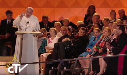 Viņš iesāka ar kādu joku no dzīves. Kāds bērns viņam reiz esot pajautājis: „Ko darīja Dievs pirms pasaules radīšanas?” „Dievs mīlēja,” esot atbildējis Svētais tēvs. „Dievs mīlēja, jo Viņš ir mīlestība. Un skaistākais, ko Dievs ar mīlestību izdarīja, bija ģimenes izveidošana, kurai Viņš iedeva visu. Viņš apveltīja ģimeni ar visu savu mīlestību, skaistumu un patiesību”. Ģimene ir īsta tad, kad spēj atvērt rokas un pieņemt visu šo mīlestību. Francisks atzina, ka ģimenes locekļi sastopas, protams, arī ar dažādām grūtībām. Viņš vēlreiz atgādināja to, ko jau bija teicis citās tikšanās reizēs ar ticīgajiem Romā: „Protams, daži no jums var man teikt: „Tēvs, Jūs tā varat runāt, jo neesat precējies.” Ģimenē ir grūtības. Dažreiz mēs strīdamies, var lidot trauki, bērni var izraisīt vecākiem lielas galvassāpes. Ģimenēs vienmēr ir krusts. Vienmēr. Šo ceļu gāja arī Dieva Dēls. Tomēr ģimenē atspīd arī augšāmcelšanās gaisma, jo Dieva mīlestība mums ir atvērusi šo ceļu. Līdz ar to, ģimene ir – piedodiet, ka lietoju šādu vārdu – „cerības fabrika”. Tā ir dzīvības un augšāmcelšanās cerība, jo Dievs mums atvēra šo ceļu.” Pāvests piebilda, ka visas grūtības, ar kādām mēs savās ģimenēs sastopamies, varam uzveikt ar mīlestību. Ar naidu un sirds šķelšanos nepanāksim neko labu! Grūtības uzvarēsim tikai ar mīlestību. Tur, kur valda mīlestība, tur valda prieks. Tāpēc ja gadās, ka vīrs ar sievu sastrīdas, vai bērni sakašķējas ar vecākiem, ir svarīgi nekad nenoslēgt dienu, neizlīgušiem mieru. Svētais tēvs runāja arī par bērniem un jauniešiem, kas ir sabiedrības nākotne, un par vecvecākiem, kas glabā un nodot tālāk pagātnes piemiņu. Pēdējie mums nodot tālāk ticību. Rūpes par vieniem un otriem ir mīlestības zīme. Svarīgi rūpēties par ģimeni un to sargāt, jo no tās ir atkarīga visas sabiedrības nākotne. Pirms svētīt ģimenes, Francisks lūdza Dievmātes un sv. Jāzepa aizbildniecību visām ģimenēm un mums visiem, lai viņi palīdz mums ticēt, ka ir vērts iestāties ģimenes labā. Sestdienas vakara vigīliju vadīja 44 gadus vecais aktieris, televīzijas producents, reperis un bijušais modelis Marks Volbergs, kurš piedzima deviņu bērnu ģimenē un izdzīvoja smagu un vētrainu jaunību. Pusaudža gados pastrādāja sīkus noziegumus un bija nonācis pat uz apsūdzēto sola. Vēlāk televīzijā reizēm izcēlās ar skandaloziem un vulgāriem izteicieniem, bet tagad, atgriezies, šis aktieris liecina, ka „ticība viņam ir devusi visu”. Pāvesta priekšā uzstājās slavenais dziedātājs Andrea Bočelli, svētās Žannas Berettas Mollas meita Emanuela Molla, Herbs Lusks, kurš bija pirmais futbolists ASV vēsturē, kurš laukumā nometās ceļos lūgšanā, kā arī daudzi citi. Radiovaticana.va Skatīties YouTube Skatīties YouTube Skatīties YouTube |
