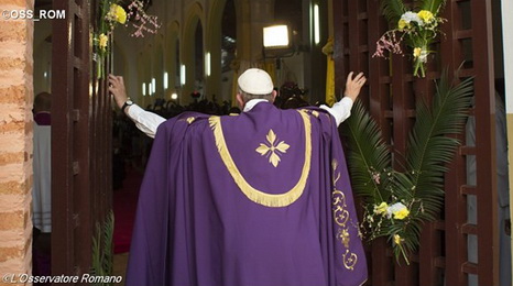 Svēto Durvju atvēršanai Centrālāfrikā, valstī, kurā jau daudzus gadus turpinās pilsoņu karš, ir īpaša nozīme, jo šeit cilvēkiem ir ļoti vajadzīga Dieva mīlestība un piedošana. Centrālāfrikas Republika ir viena no nabadzīgākajām un politiski nestabilākajām valstīm Āfrikas kontinentā. Starp daudziem diktatoriem īpaši izcēlās Žans Bedels Bokasa, kurš personīgi piedalījās 200 bērnu spīdzināšanā un egzekucijā, kuri atteicās nēsāt diktatora sievas projektēto skolas formu. 2011. gadā valstī sākās militārā cīņa starp nemierniekiem un armiju, bet divus gadus vēlāk musulmaņu nemiernieku grupējums „Seleka” veica uzbrukumu valsts galvaspilsētai Bangi, padzenot prezidentu. Laika gaitā politiskais konflikts pārauga reliģiskajā konfliktā. Musulmaņi uzsāka kristiešu iznīcināšanu. Kristieši sāka veidot pašaizsardzības vienības „Anti-balaka”, kuras savukārt uzsāka teroru pret valsts musulmaņu iedzīvotājiem. Tikai pateicoties starptautisko institūciju pūliņiem tika pieņemta konflikta atrisinājuma programma, tomēr līdz pat pāvesta ierašanās brīdim notiekošās kaujas liecina par to, cik trausla ir cerība uz mieru un izlīgumu šajā valstī. Ieradies katedrālē, kur bija sapulcējušies tūkstošiem priesteru, reliģisko ordeņu locekļu un jauniešu, pāvests teica īsu uzrunu. Viņš Bangi nosauca par pasaules garīgo galvaspilsētu. Pāvests sacīja, ka šajā zemē, kas cieš karu un nabadzību, iesākas Dieva žēlsirdībai veltītais jubilejas gads, aicinot ticīgos lūgties par mieru Centrālāfrikā un pasaulē. Atvēris Bangi katedrāles Svētās Durvis, Francisks izgāja pa tām kā pirmais svētceļnieks. Vēlāk viņš vadīja dievkalpojumu, kas bija viņa vizītes Centrālāfrikā kulminācija. Homīlijā pāvests skaidroja Apustuļu darbu grāmatas fragmentu par Pēteri un Jāni, kuri tā vietā, lai pasniegtu ziedojumu pie svētnīcas ieejas gulošajam paralītiķim, izdziedināja viņu. Arī šodien kristieši ir aicināti nest dziedināšanu un mierinājumu tiem, kuri ir zaudējuši cerību, palīdzēt tiem uzsākt jaunu dzīvi, palīdzēt „pārcelties uz otru krastu” (Lk 8,22). "Jēzus nesūta mūs vienus pašus uz otru krastu, bet gan mudina, lai mēs to veiktu kopā ar Viņu. Un katrs no mums to dara īstenojot savu paaicinājumu. Mums ir jāapzinās, ka šo pārcelšanos uz otro krastu varam īstenot tikai Viņā, iekšēji atbrīvojoties no asinsradniecības saišu koncepcijas, kas atdala, lai veidotu Baznīcu – Dieva ģimeni, kas ir atvērta visiem, kas rūpējas par tiem, kuriem visvairāk ir nepieciešama palīdzība", sacīja pāvests. Pārcelties uz otro krastu nozīmē pieredzēt savā dzīvē Dieva piedošanu un dalīties priekā par to ar citiem, sacīja Francisks. Paši saņēmuši piedošanu, esam aicināti piedod arī citiem. Pāvests norādīja uz kristīgā aicinājuma būtību: „Esiet pilnīgi, kā arī jūsu Tēvs Debesīs ir pilnīgs!” (Mt 5,48). Viens no šādas pilnības pamatnoteikumiem ir mīlestība pret ienaidniekiem, kas palīdz pārvarēt naida un atriebības kārdinājumus. Jēzus bieži runā par šo kristīgās liecības aspektu. Evaņģelizācijas darbā iesaistītajiem cilvēkiem pirmām kārtām ir jābūt piedošanas un izlīguma speciālistiem, mīlestības un žēlsirdības ekspertiem. Tieši šādā veidā palīdzēsim saviem brāļiem un māsām „pārcelties uz otru krastu”, atklājot viņiem mūsu spēka, mūsu cerības, mūsu prieka noslēpumu, kura avots ir Dievs, – sacīja Francisks. Naida un izmisuma vētras laikā kristietis nedrīkst aizmirst, ka Dievs ir stiprāks par visiem un visu, Viņa pēdējais vārds ir mīlestība, atgādināja pāvests. „Visur, bet pirmām kārtām tur, kur valda vardarbība, netaisnība un vajāšanas, kristieši ir aicināti ar vārdiem un darbiem liecināt par Dievu, kas ir Mīlestība. Homīlijas noslēgumā Svētais tēvs aicināja Centrālāfrikas iedzīvotājus izbeigt cīņas un kopīgiem spēkiem meklēt mieru: "Pie visiem tiem, kuri ķeras pie šīs pasaules ieročiem, vēršos ar aicinājumu: atmetiet nāves līdzekļus un ietērpieties taisnīguma, mīlestības un žēlsirdības bruņās, lai atgūtu mieru. Kristus mācekļi – priesteri, konsekrētās personas un laji dzīvo valstī ar tik izteiksmīgu nosaukumu, valstī, kas atrodas pašā Āfrikas sirdī, valstī, kas ir aicināta atklāt Kungu – visā labā centru. Izlīgums, piedošana, mīlestība un miers. Āmen!" Pēc dievkalpojuma pāvests tikās ar jauniešiem. Bangi katedrāles laukumā sapulcējās tūkstošiem jauniešu. „Arī šodien ir iespējams mīlēt ienaidniekus! Ir iespējams piedot tam, kas mums ir pārinodarījis,” – sacīja Svētais tēvs. Jauniešu vārdā pāvestu apsveica Īvens Demba. Viņš uzsvēra, ka tikšanās simbols ir banānkoks, kam ir dziļas saknes un kas dāvā bagātīgus augļus. Tikmēr Centrālāfrikas iedzīvotāji, kuriem nav labu un dziļu sakņu, pārbaudījumu brīžos viegli pakļaujas atriebības, vardarbības, laupīšanas un iznīcības kārdinājumiem. Jaunietis norādīja uz lielajiem izaicinājumiem: panākt mieru, mazināt nabadzību, nodrošināt bērniem izglītību. Daudzi vēlas atstāt valsti, lai citur meklētu labākus dzīves apstākļus. „Tava vizīte dāvā mums mierinājumu, prieku, un palīdz saprast, ka ne viss ir zaudēts. Saki mums, Svēto tēv, ko tu sagaidi no Centrālāfrikas jauniešiem? Kas mums ir jādara, lai atgūtu mieru un labklājību? Pāvests atbildēja, sakot, ka „bēgšana no izaicinājumiem nav labākais atrisinājums.” Vajag drosmīgi cīnīties par labo. Viņš norādīja uz lūgšanas vareno spēku, kas palīdz uzvarēt ļaunumu un tuvoties Dievam. Vai jūs lūdzaties? – jautāja pāvests. Runājot par mieru, viņš skaidroja, ka tas nav tikai dokuments, ko mēs parakstām. „Miers tiek veidots no dienas dienā ar mūsu roku dar