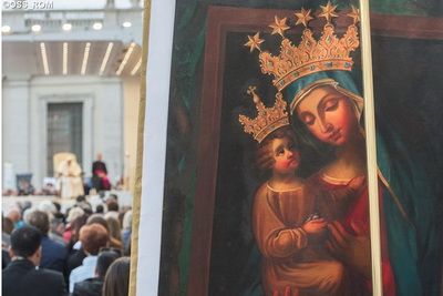 Viņš paskaidroja, ka noslēpumi, ko apceram, ir konkrēti žesti, kuros attīstās Dieva darbība mūsu priekšā. Caur lūgšanu un Jēzus Kristus dzīves meditāciju, mēs redzam Viņa žēlsirdīgo vaigu, kas tiek pievērsts visiem cilvēkiem dažādās viņu dzīves vajadzībās. Šai gājumā mūs pavada Marija, norādot uz Dēlu, kas izstaro Tēva žēlsirdību. Viņa patiešām ir Odigitria – Māte, kas rāda ceļu, ko esam aicināti iet, lai būtu patiesi Jēzus mācekļi. Katrā Rožukroņa noslēpumā jūtam viņas tuvumu un kontemplējam viņu kā pirmo sava Dēla mācekli, kura praksē īsteno Tēva gribu. Pāvests apliecināja, ka Rožukroņa lūgšana mūs neattālina no dzīves rūpēm. Tieši pretēji, tā prasa mūsu vitālu līdzdalību katras dienas vēsturē, lai spētu saskatīt Kristus klātbūtnes zīmes mūsu vidū. Ikreiz, kad kontemplējam kādu brīdi, kādu Kristus dzīves noslēpumu, esam aicināti atzīt, kādā veidā Dievs ienāk mūsu dzīvē, lai Viņu pieņemtu un Viņam sekotu. Tādējādi atklājam ceļu, kas mūs ved pie Kristus, kalpojot brāļiem. Pieņemot un sevī asimilējot dažus svarīgus Jēzus dzīves notikumus, mēs piedalāmies Viņa evaņģelizācijas darbā, lai Dieva valstība pieaugtu un izplatītos pasaulē. Esam mācekļi, kā arī misionāri un Kristus nesēji tur, kur Viņš izrāda vēlēšanos būt klātesošs. Tāpēc mēs nedrīkstam Viņa klātbūtnes dāvanu turēt ieslēgtu mūsos. Tieši pretēji, esam aicināti ar visiem dalīties Viņa mīlestībā, Viņa maigumā, labestībā, žēlsirdībā. Tas ir dalīšanās prieks, kas neapstājas ne pie kā, jo nes atbrīvošanas un pestīšanas vēsti. Marija ļauj mums saprast, ko nozīmē būt Kristus mācekļiem. Viņa, kas vienmēr ir bijusi izraudzīta par Māti, iemācījās būt par mācekli. Viņas pirmais žests bija klausīties Dievu. Viņa paklausīja eņģeļa vēstij un atvēra savu sirdi, lai pieņemtu tajā dievišķās mātišķības noslēpumu. Viņa sekoja Jēzum, uzklausot katru vārdu, kas izgāja no Viņa mutes. Marija visu glabāja savā sirdī un kļuva par sava Dēla paveikto žestu dzīvo atmiņu. Tie bija žesti, lai mūsos liktu iemājot ticībai. “Tomēr,” teica pāvests, “nepietiek tikai klausīties.” Lai arī tas, bez šaubām, ir pirmais solis, tomēr klausīšanās ir jāpārvērš konkrētā darbībā. Māceklis savu dzīvi liek kalpošanā Evaņģēlijam. Tāpat arī Marija steidzās pie Elizabetes, lai viņai palīdzētu. Betlēmē Marija laida pasaulē Dieva Dēlu, Kānā viņa rūpējās par jaunlaulātajiem, Golgātā palika zem Jēzus krusta un pildot Viņa gribu, kļuva par Baznīcas Māti. Pēc Kristus augšāmcelšanās Marija iedrošināja apustuļus, kuri bija pulcējušies Pēdējo Vakariņu namā, gaidot Svēto Garu, kas tos pārveidoja par drošsirdīgiem Evaņģēlija vēstnešiem. Visu savu dzīvi Marija ir īstenojusi to, kas Baznīcai tiek prasīts, lai nemitētos glabāt Kristus piemiņu. Marijas ticībā redzam, kā atdarīt mūsu sirds durvis, lai paklausītu Dievam. Viņas pašaizliedzībā atklājam to, cik uzmanīgiem mums ir jābūt pret citu vajadzībām. Viņas asarās rodam spēku, lai mierinātu tos, kas cieš. Katrā no šiem dzīves brīžiem, caur Mariju izpaužas dievišķās mīlestības bagātība, kas panāk pretim katram cilvēkam viņa ikdienas vajadzībās. Pāvests klātesošos mariāniskās vigīlijas dalībniekus aicināja lūgt Debesu Māti ar vissenāko lūgšanu, ar kādu kristieši, jo īpaši grūtību un moceklības brīžos, ir vērsušies pie viņas: “Pie tevis vēlamies patverties, Svētā Dieva Māte! Nenicini mūsu lūgšanas, kas atrodamies pārbaudījumos, bet atbrīvo mūs no visa ļauna, ak godības pilnā un svētā Jaunava!” Radiovaticana.va Foto: L'Osservatore Romano |