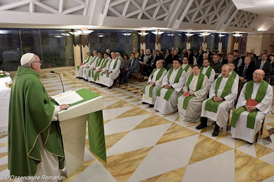 Francisks norādīja, ka kristietim vienmēr vajadzētu sajust pār sevi Dieva svētību un iet uz priekšu, lai darītu labu. Kristietis ir Dieva Tēva svētīts cilvēks – viņš sacīja. Taču kādas ir šīs svētības iezīmes? Pirmā iezīme: Kristietis ir izvēlēts. Dieva izrādītā izvēle ir ļoti personiska. Viņš aicina mūs katru personīgi, bet nevis kā kādu masu. „Padomāsim par laulāto pāri, kas gaida bērnu”, mudināja Svētais tēvs. „Viņiem interesē, kāds būs šis bērns. Kāds būs viņa smaids? Kā viņš runās? Es uzdrošināšos apgalvot, ka arī Tēvs ir sapņojis par katru no mums kā tētis un mamma sapņo par gaidāmo bērnu. Un tas tev sniedz lielu drošību. Tēvs gribēja nevis ļaužu masu, bet tevi: tevi, tevi un tevi. Katru no mums. Tas ir mūsu attiecību ar Dievu pamats. Mēs runājam par Tēvu, kurš mūs mīl, kurš mūs ir izvēlējis, kurš mums ir devis vārdu”. Pāvests piebilda, ka, apzinoties šo patiesību, proti, ka mēs esam Dieva izvēlētie bērni, savā sirdī piedzīvojam lielu mierinājumu. Mēs nejūtamies atstāti, jo mums nesaka: Tiec taču pats galā kā māki! Mēs esam Viņa izvēlētie un mīļotie bērni. Otrā iezīme: īsts kristietis vienmēr jūt vajadzību saņemt no Dieva piedošanu. Tas, kurš nejūt šādu vajadzību, nav īsts kristietis. Pateicoties Kristus izlietajām asinīm, Dievs mums visiem ir piedevis. Šajā sakarā Francisks jautāja, par kādu piedošanu ir runa? Tad viņš mudināja: „Pieliec nedaudz pūles un atsauc atmiņā slikto, ko esi darījis! Nevis to, ko ir darījis tavs draugs, kaimiņš vai kaimiņiene, bet tu pats”. Es esmu darījis to un to, un Kungs man visu ir piedevis. Lūk, tāpēc es esmu Dieva svētīts! Trešā iezīme: kristietis nekad nestāv uz vietas, bet vienmēr atrodas ceļā, lai darītu labu. Viņš vienmēr atrodas ceļā uz pilnību, uz tikšanos ar Kristu, kurš mūs ir atpestījis. Kristietis, kurš stāv uz vietas, līdzinās Evaņģēlijā aprakstītajam cilvēkam, kurš saņēma talentu un ieraka to zemē. Viņš baidījās dzīvot, baidījās pazaudēt talentu, baidījās no sava kunga. Viņš apraka talentu baiļu vai ērtības dēļ, lai mierīgi pavadītu savu dzīvi. Taču kristietis vienmēr ir ceļā, lai darītu labu un ietu uz priekšu. Noslēdzot homīliju un apkopojot iepriekš sacīto, pāvests atgādināja, ka tā ir „kristieša identitāte”. Viņš ir svētīts, jo ir izvēlēts, saņēmis piedošanu un atrodas ceļā. Radiovaticana.va Foto: L'Osservatore Romano |