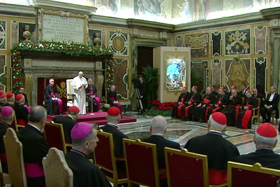 Dievs vēlējās piedzimt maziņš, jo Viņš gribēja būt mīlēts. “Lūk, kā Ziemassvētku loģika apgāž pasaulīgo loģiku, varas loģiku, komandēšanas loģiku, farizejisko loģiku,” norādīja pāvests. Tieši šādā pazemības gaismā, kas izgaismo Kristus Bērniņa dievišķo vaigu, Svētais tēvs vēlējās runāt par Romas kūrijas reformu, par tās plānu, vadības kritērijiem, jau noietajiem soļiem, bet jo īpaši par to, kāpēc tie ir jāiet. Šai ziņā Francisks pieminēja ignācisko garīgo vingrinājumu metodi, proti: “deformata reformare, reformata conformare, conformata confirmare un confirmata trasformare.” Šo latīņu valodas vārdu nozīmi viņš izklāstīja uzrunas gaitā. Pāvests teica, ka reforma kūrijā var būt divējāda. Pirmkārt, tā ir jādara atbilstoša, jeb latīņu valodas vārdiem runājot, “konformēta” Labajai Vēstij, kas ir priecīgi un droši jāsludina visiem, jo īpaši nabadzīgajiem, pēdējiem un atstumtajiem. Tāpat reformai ir jābūt atbilstošai laika zīmēm un visam labajam, ko ir sasniedzis cilvēks, lai labāk spētu iet pretim vīriešu un sieviešu prasībām, kuriem esam aicināti kalpot. Tai pašā laikā kūrija ir jādara atbilstoša savam mērķim, kas nav nekas cits kā sadarbība ar svētā Pētera pēcteci viņa kalpojumā. Francisks atzīmēja, ka kūrija nav nekustīgs aparāts, tāpēc reforma galvenokārt ir ceļojošās Baznīcas vitalitātes zīme. Tā kā Baznīca ir dzīvs organisms, tad tā ir arī “semper reformanda” – reformēta tieši tāpēc, ka tā ir dzīva. Pāvests sacīja, ka reforma nav pašmērķis, bet gan izaugsmes un jo īpaši atgriešanās process. Reforma nav estētisks mērķis, lai kūriju padarītu skaistāku, lai izdaiļotu tās novecojušo ķermeni, iztaisnotu grumbas sejā. “Nē, dārgie brāļi, ne jau no grumbām ir jābaidās Baznīcā, bet gan no traipiem,” sacīja Francisks. Šai perspektīvā pāvests uzsvēra, ka reforma būs efektīva tikai un vienīgi tad, ja tā tiks veikta ar “atjaunotiem”, nevis vienkārši “jauniem” cilvēkiem. Ar personāla nomainīšanu nepietiktu, bet ir jārūpējas par to, lai kūrijas locekļi atjaunotos garīgi, cilvēciski un profesionāli. Nepietiek arī ar nemitīgu formāciju, bet visvairāk par visu ir vajadzīga nemitīga atjaunošanās un šķīstīšanās. Bez mentalitātes maiņas funkcionāli pūliņi būs veltīgi. Pāvests nosauca arī divpadsmit reformas kritērijus. Pirmais – personīga atgriešanās, bez kuras nav iespējams mainīt nevienu struktūru. Otrais kritērijs – pastorālā atgriešanās. “Ir nepieciešams, lai Dieva – Labā Gana vaigs mūs apgaismo, šķīstī, pārveido un pilnīgi atjaunotus atgriež pildīt savu misiju,” sacīja Francisks. Viņš piebilda, ka kūrijas personālam ir jāvadās pēc kalpošanas un kopības garīguma, jo tās ir zāles pret visām liekulīgu ambīciju un iluzoriskas sāncensības indēm. Trešais kritērijs – misionārisms, jeb kristocentrisms. Tas ir jebkura ekleziālā kalpojuma galvenais mērķis, proti, nest Labo vēsti visām zemes malām. Labas struktūras ir lietderīgas tikai tad, ja tās caurauž dzīvība. Bez dzīvības un autentiska evaņģēliskā gara, bez uzticības Baznīcai, jebkura tās struktūra, arī pati jaunākā sarūsē pavisam īsā laikā. Ceturtais kritērijs – racionālisms. Pamatojoties uz principu, ka visi dikastēriji ir vienlīdzīgi savā starpā, ir radusies nepieciešamība tos racionalizēt, lai izceltu katram dikastērijam raksturīgo kompetenci. Šī kompetence ir jārespektē, bet arī racionāli un efektīvi jāsašķiro. Tātad, neviens dikastērijs nevar sev piedēvēt cita dikastērija kompetenci. No otras puses, visu dikastēriju tiešs atsauces punkts ir pāvests. Piektais kritērijs – funkcionalitāte. Francisks paskaidroja, ka divu, vai vairāku dikastēriju, kuru kompetence ir bijusi līdzīga, apvienošana vienā ir vajadzīga, lai piešķirtu tam lielāku nozīmi, tai skaitā arī ārpus Baznīcas. Funkcionalitāte prasa nemitīgi pārskatīt arī personāla lomu, atbilstību kompetencei un atbildību. Rezultātā, var rasties nepieciešamība pēc personāla pārcelšanas, jaunu personu pieņemšanas, darba pārtraukšanas, kā arī paaugstināšanas. Sestais kritērijs – nemitīga atjaunošana. Tas nozīmē prast lasīt laika zīmes un rūpēties, lai dikastēriji un to personāls atbilstu laika prasībām un universālās Baznīcas vajadzībām. Septītais kritērijs – pieticība. Šai perspektīvā ir nepieciešama kūrijas vienkāršošana un samazināšana, proti, dikastēriju apvienošana saskaņā ar kompetenci un iekšējā katra dikastērija vienkāršošana, eventuāla vairs nevajadzīgu ofisu slēgšana, kā arī dažādu komisiju, akadēmiju, komiteju un citu struktūru iekļaušana dikastērijos. Astotais kritērijs – subsidiaritāte. Tas nozīmē savstarpēju katra dikastērija sadarbību un vienotību. Vatikāna valsts sekretariātam ir uzticēts koordinēt visas kūrijas struktūras. Devītais kritērijs – sinodalitāte. Kūrijas darbam ir jābūt sinodālam. Ir jātiekas dikastēriju vadītājiem un pāvestam, jāsasauc sanāksmes. Dikastēriju skaita samazināšana prefektiem ļaus biežāk tikties ar pāvestu, ko nav bijis iespējams efektīvi īstenot skaitliski lielā grupā. Desmitais kritērijs – katolicisms. Pāvesta līdzstrādniekiem ir jāatspoguļo Baznīcas katolicisms, pieņemot personālu no visām pasaules malām, tai skaitā priesterus, konsakrētās personas, diakonus un lajus, kuru izvēle ir jāveic, pamatojoties uz viņu garīgo dzīvi, morālo stāju un profesionālo kompetenci. Pāvests atzīmēja, ka ir nepieciešams darbā iesaistīt vairāk laju, jo īpaši tais dikastērijos, kuros viņi var izrādīt lielāku kompetenci, nekā klēra locekļi un konsakrētās personas. Lielu nozīmi Francisks piešķir arī sieviešu lomai Baznīcas dz