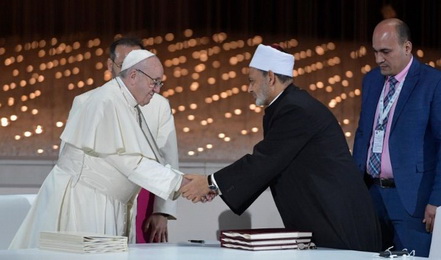 "Mēs esam šeit, lai ilgotos pēc miera, veicinātu mieru un būtu miera instrumenti," viņš sacīja. Pāvesta 27. apustuliskā ceļojuma logo ir attēlots balodis ar olīvu zariņu, tādējādi atsaucot atmiņā Noasa plūdus. Kā lasām Bībelē, lai pasargātu cilvēci no iznīcināšanas, Dievs lika Noasam kopā ar visu ģimeni ieiet arkā. Uzrunā Francisks norādīja, ka šodien, lai saglabātu mieru, arī mums, Dieva vārdā, visiem kopā, kā vienai ģimenei, ir jāieiet arkā, kas varētu kuģot pa pasaules vētru plosītām jūrām. Šī arka ir "brālības arka" – viņš uzsvēra. Romas katoļu Baznīcas vadītājs apliecināja, ka, no Apvienotajiem Arābu Emirātiem draudzīgi un ar cieņu vēršas pie visām Arābijas pussalas zemēm un sūta tām savu vissirsnīgāko sveicienu. Runājot par brālību, pāvests atgādināja, ka izejas punkts ir Dieva atzīšana par visas cilvēces Radītāju, kurš grib, lai mēs visi šai pasaulē dzīvotu kā brāļi un māsas. Brālības pamats ir tas, ka mēs visi esam Dieva radītie cilvēki un visi esam apveltīti ar vienādu personas cieņu. Tāpēc neviens nevar būt citu kungs vai vergs. Nav iespējams godināt Radītāju, nesargājot šo katras personas un katra cilvēka dzīvības sakrālo raksturu – uzsvēra Francisks. Dieva acīs visi ir vienlīdz dārgi. Atzīt, ka visiem cilvēkiem pienākas vienādas tiesības, nozīmē pagodināt Dieva Vārdu. “Dieva Radītāja vārdā pienākas bez vilcināšanās nosodīt ikvienu vardarbību, tāpēc ka Dieva Vārda izmantošana, lai attaisnotu naidu un vardarbību pret brāli, ir smaga šī vārda profanācija. Nav tādas vardarbības, ko varētu ar reliģiju attaisnot.” Turpinot uzrunu, pāvests atgādināja, ka brālības ienaidnieks ir individuālisms. Tas apdraud visus dzīves aspektus, tai skaitā, cilvēka reliģisko dzīvi. Būt īsti reliģiskam nozīmē no visas sirds mīlēt Dievu un savu tuvāko kā sevi pašu – viņš skaidroja. Svētais tēvs pauda gandarījumu, ka Apvienotajos Arābu Emirātos tiek atļauta un nodrošināta kulta brīvība. Atļauja brīvi paust savu ticību ir būtisks nosacījums tam, lai cilvēks varētu sevi īstenot. Pāvests piebilda, ka brālības izpausme ir arī reliģiskais plurālisms. Kā mums pastāvēt kā vienai cilvēku saimei? Kā nosargāt šo vērtību? Kā dzīvināt nevis teorētisku brālību, bet tādu, kas īstenojas reālā dzīvē? Kā panākt, lai savas piederības vārdā "iekļaušana" gūst virsroku pār "izslēgšanu"? Kā, galu galā, reliģijas var būt par brālības kanāliem, nevis par barjerām, kas šķir? – uzrunājot brālības veicināšanai veltītās starpreliģiju tikšanās dalībniekus, jautāja pāvests. Francisks atgādināja, ka cilvēku saimi pienākas sargāt, un tas notiek, pateicoties reālam ikdienas dialogam. No vienas puses, katram ir jāsaglabā savu identitāti un nav no tās jāatsakās, lai izpatiktu otram, no otras puses – mums nav jābaidās no tā, kas ir citāds un atšķirīgs. Mums ir jārespektē otrs cilvēks, jārespektē viņa brīvība un viņa pamattiesības. Īpaša nozīme ir reliģiskajai brīvībai, kas neaprobežojas tikai ar kulta brīvību, bet kas iekļauj sevī to, lai es saskatītu otrā brāli, tādu pašu cilvēka bērnu kā es, kuru Dievs ir radījis brīvu, un kuru, līdz ar to, neviena cilvēciskā institūcija nedrīkst spiest. Spiediens nedrīkst notikt arī Dieva vārdā. Drosme atzīt to, kas ir citādāks, ir "dialoga dvēsele" – skaidroja pāvests. Dialoga pamatā jābūt nodomu tīrībai. Citējot krievu rakstnieku Dostojevski, Francisks atgādināja, ka tas, kurš melo sev un klausās savos melos, nonāk līdz tam, ka vairs nespēj atšķirt patiesību ne sevī, ne ap sevi un sāk vairs necienīt ne sevi, ne citus. Izlikšanās un liekulība grauj dialogu. Nevar sludināt brālību, bet rīkoties pretēji. Lai veicinātu dialogu, būtiska nozīme ir lūgšanai, jo lūgšana atbrīvo sirdi no noslēgšanās sevī. Pāvests norādīja, ka lūgšana ir pirmā lieta, kas mums jādara starpreliģiju dialoga labā. Mums vienam par otru ir jālūdzas. Mēs esam brāļi! Vai nu mēs kopā veidosim nākotni, vai nebūs nākotnes. Citas alternatīvas nav – viņš uzsvēra. Uzrunā pāvests norādīja arī uz izglītību un taisnīgumu kā diviem miera spārniem. Jauniešiem, kuri no malu malām saņem negatīvās un viltus ziņas, jāiemācās nepadoties materiālisma vilinājumam, naidam un aizspriedumiem. Viņiem ir jāiemācās attiecīgi reaģēt uz netaisnību un pagātnes sāpīgo pieredzi, un stingri iestāties citu cilvēku tiesību labā. Pienāks diena, kad viņi mūs tiesās. Ja būsim viņos ielikuši stingrus pamatus jaunu civilizācijas tikšanās saišu veidošanai, tiesa būs mums labvēlīga, bet, ja būsim pametuši viņus vienus pašus, tas nāks mums par ļaunu. Taisnību lēnām saēd netaisnības vēzis – atzina Francisks, atgādinot, ka nevaram ticēt Dievam un vienlaikus netiekties dzīvot ar visiem taisnīgi. Aplūkojis brālību kā miera arku, uzrunas beigu daļā pāvests pievērsās tuksneša simbolam. Apvienotie Arābu Emirāti, kur tuksnesis tika pārveidots par auglīgu un viesmīlīgu vietu, kur smiltis satiekas ar debesskrāpjiem, ir svarīgas krustceles starp Rietumiem un Austrumiem, Ziemeļiem un Dienvidiem. Tā ir kultūru un reliģiju satikšanās vieta, kur notiek strauja attīstība un kur dažādu zemju cilvēki var atrast sev darbu. Pāvests norādīja, ka arī attīstībai ir savi pretinieki. Attīstības šķērslis ir vienaldzība. Tīri utilitāra attīstība nevar nest īstu un ilgtspējīgu progresu. Tikai integrāla un saliedēta attīstība var pavērt cilvēka cienīgu nākotni. Noslēgumā pāvests pieminēja kristiešus, kuri dzīvo Apvienotajos Arābu Emirātos un piedalās valsts labklājības celšanā ne tikai ar savām profesionālajām spējām, bet arī ar savu ticību. Pateicoties respektam un