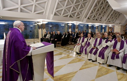 Sprediķī pāvests skaidroja dienai paredzētos Svēto Rakstu lasījumus. Šoreiz viņš pakavējās pie Izceļošanas grāmatas 32. nodaļas, kurā aprakstīta Mozus iestāšanās un lūgšana par savu tautu, ko bija izvedis no Ēģiptes zemes. Dievs tautu bija atmetis, jo tā sāka pielūgt no metāla izlietu teļu. Francisks uzsvēra, ka Mozus lūgšana ir ļoti drosmīgs solis. Viņš nebaidījās vērsties pie Dieva ne tikai ar savu pazemību, bet arī ar pārliecību, atgādinot Viņam Ābrahamam, Izākam un Jēkabam dotos apsolījumus, ka no viņu pēctečiem izveidos lielu tautu. Mozus it kā gribēja sacīt: «Tu taču viņiem apsolīji, un apsolījums ir jāizpilda». Tāda lūgšana ir iespējama tad, kad mēs sarunājamies ar Dievu «vaigu pret vaigu», teica pāvests. “Lai tā lūgtos, ir vajadzīga drosme. Bet mēs bieži esam remdeni. Varbūt kāds teiks: «Jā, es lūdzos, bet tikai tādēļ, ka man ir šāda vai tāda problēma.» Jā, es noskaitīšu divas reizes lūgšanu «Tēvs mūsu», divas reizes lūgšanu «Esi sveicināta», un ar to pietiks. Nē, šāda papagaiļa stila lūgšana nav laba. Patiesa lūgšana ir saruna ar Jēzu. Kad mēs lūdzamies par kādu, tad to ir jādara ar drosmi. Cilvēki savā ikdienas sarunā bieži lieto vārdus: «Vajag iet uz pilnu banku», un tie izsaka ļoti daudz. Lūgšana par citiem ir ļoti svarīga. Lai ietu uz priekšu, ir vajadzīga drosme. Tomēr sirdī var iezagties šaubas: «Es lūdzos, bet vai es varu būt drošs, ka Kungs mani uzklausīs?» Mūsu garants ir Jēzus. Viņš ir lielais starpnieks.” Uzrunas turpinājumā pāvests norādīja, ka Jēzus, kurš uzkāpa Debesīs un sēž pie Tēva labās rokas, iestājas un lūdzas par katru no mums. Pirms savām ciešanām Jēzus apsolīja Pēterim, ka lūgsies par viņu, lai viņa ticība būtu stipra. Šajā brīdī Jēzus lūdzas arī par mums. Viņš paņem mūsu lūgšanu un to ieliek Tēva rokās. Jēzum nekas nav jāsaka. Viņš parāda Tēvam savas rētas. Tēvs redz Dēla rētas un dod žēlastību, skaidroja Francisks. Viņš aicināja dziļāk apzināties lūgšanas svarīgo nozīmi savā dzīvē. Vaticannews.va |