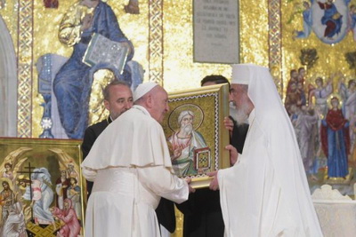 Rumāņu pareizticīgo patriarhāts pastāv kopš 1925. gada. Tā vadītājs ir 1951. gadā dzimušais patriarhs Daniels. Viņš tika ievēlēts par Bukarestes arhibīskapu un Rumānijas pareizticīgo Baznīcas patriarhu pēc patriarha Teoktista nāves 2007. gadā. Pils, kur atrodas patriarhāta mītne, pagājušajā gadsimtā bija Deputātu kameras sēdeklis. Pie ieejas pāvestu sagaidīja patriarhs Daniels, ar kuru vispirms notika privāta tikšanās. "Conventus" zālē, kur Romas katoliskās Baznīcas vadītājs tikās ar Rumānijas pareizticīgo Baznīcas līderiem, ir izvietota piemiņas plāksne, kas atgādina par 1999. gada 8. maijā notikušo patriarha Teoktista un sv. Jāņa Pāvila II tikšanos. Francisks, tiekoties ar Rumānijas pareizticīgo Baznīcas patriarhu un pārējiem sinodes locekļiem, teica uzrunu, kurā norādīja, ka ir ieradies šeit kā svētceļnieks, lai viņu – savu brāļu vaigā saskatītu paša Kunga vaigu. Viņš atzina, ka Romas katolisko Baznīcu un Rumānijas pareizticīgo Baznīcu vieno "asiņu brālības" saites. Tām ir "kopīgs mantojums", jo daudzi šīs zemes dažādu kristīgo kopienu brāļi un māsas cieta vajāšanas un ticības dēļ atdeva par Kristu savu dzīvību. Viņi kopā atradās cietumos un atbalstīja viens otru. Tas, par ko viņi cieta un atdeva savu dzīvību, ir pārāk dārgs mantojums, lai to varētu aizmirst. Pāvests pieminēja arī savu priekšgājēju Jāni Pāvilu II, kurš pirms 20 gadiem tikās ar Rumānijas pareizticīgo patriarhu Teoktistu. Pateicoties tam ne tikai uzplauka attiecības starp pareizticīgajiem un katoļiem Rumānijā, bet arī attīstījās dialogs abu konfesiju starpā vispār. Sv. Jāņa Pāvila II ceļojums uz Rumāniju bija pirmais Romas bīskapa ceļojums uz valsti, kur vairākums iedzīvotāju ir pareizticīgie. Rumāņu tauta toreiz Bukarestē spontāni sauca "Vienotību, vienotību!". Tā bija pravietiska cerības vēsts, kas ievadīja jaunu laiku – laiku, lai ietu kopā. Francisks šodienas uzrunā pievērsās vairākiem šīs "kopā iešanas" aspektiem. Viņš aicināja iet kopā, paturot atmiņā savas saknes, iet kopā, klausoties Kungu, un iet kopā pretī jauniem Vasarsvētkiem. Svētais tēvs aicināja kristiešus kopā klausīties Kungu īpaši šajos laikos, kuros pasaules ceļi mūs ir noveduši pie straujām sociālām un kultūras pārmaiņām. Tehnoloģiskais progress un ekonomiskā labklājība daudziem gan ir nesusi labumu, bet lielākais vairums tomēr ir palikuši nenovēršami izslēgti. Tai pat laikā, globalizācijas rezultātā, cilvēki ir attālinājušies no vērtībām, ir notikusi ētiskā lejupslīde un vājinājušās kopīgās dzīves saites. Pēdējo gadu laikā bailes tās pat ir saindējušas un nereti tiekam novesti pie ieraušanās sevī un naidīgas attieksmes. Romas viesis uzsvēra, ka abu konfesiju kristiešiem ir jāpalīdz viens otram nepadoties "naida kultūras" un individuālisma kārdinājumiem. Saišu trauslums, kas gala rezultātā izolē cilvēks, atstāj negatīvu iespaidu uz ģimeni un visu sabiedrību. Tāpēc ir jāpieliek pūles un jāiet pretī saviem brāļiem un māsām, sevišķi svarīgi ir atbalstīt jauniešus viņu grūtībās. Mēs varam sasniegt ceļa mērķi, pateicoties neatlaidīgai kopīgai lūgšanai, lūdzoties, lai Kungs paliek ar mums, kā to darīja Emmausas mācekļi (sal. Lk 24, 28-29). Viņš, kurš atklājās pie maizes laušanas, aicina uz tuvākmīlestību, uz kopīgu kalpošanu. Pirms nekā "runāt par Dievu", Viņš mūs aicina "dot Dievu", nebūt pasīviem labajā, būt gataviem celties un aktīvi darboties. Kā piemēru pāvests minēja daudzas pa Rietumeiropu izkaisītās rumāņu pareizticīgo kopienas, kas lieliski sadarbojas ar katoļu Baznīcas diecēzēm, dzīvo savstarpējā uzticībā un draudzībā. Francisks uzsvēra, ka vēsts par Kunga augšāmcelšanos ir apustuļu sludinātās vēsts pats kodols. Viņi šo vēsti nodeva tālāk un tā tiek glabāta mūsu Baznīcās. Kristus mācekļiem Lieldienas bija jauna ceļa sākums, kurā līdz pat Vasarsvētkiem netrūka arī baiļu un nedrošības. Laiks no Lieldienām līdz Vasarsvētkiem ir laiks, kad mēs, aizbildinot Vissvētākajai Jaunavai Marijai, varam vienoties kopīgā lūgšanā un piesaukt viens par otru Svēto Garu – sacīja pāvests. Uzrunas noslēgumā viņš novēlēja, lai visus atjauno Svētais Gars, lai Viņa uguns sadedzina visas mūsu aizdomas, lai Viņa vējš aizpūš projām visu, kas mums traucē kopīgi liecināt par jauno dzīvi, ko Kungs mums dod. Francisks vēlēja, lai Svētais Gars, brālības veidotājs, dod mums žēlastību iet kopīgu ceļu par godu Trīsvienīgajam Dievam un par labu viens otram, lai mēs varētu palīdzēt saviem brāļiem saskatīt Jēzu. Pēc tikšanās ar Rumānijas pareizticīgās Baznīcas Pastāvīgās sinodes locekļiem, pāvests devās uz Tautas pestīšanas pareizticīgo katedrāli, lai tur lūgtos "Tēvs mūsu" lūgšanu. Katedrālē, kas atrodas pašā Bukarestes centrā, var ietilpt 5 tk. cilvēku. To 2018. gadā iesvētīja patriarhs Daniels kopā ar Konstantinopoles patriarhu Bartolomeju. Celtniecības darbi pilnībā tiks pabeigti tikai 2024. gadā. 70 % no finansējuma ir piešķīrusi valsts. Sv. Jānis Pāvils II sava ceļojuma uz Rumāniju laikā, 1999. gada maijā, jaunā dievnama celtniecībai ziedoja 200 tk. dolāru lielu naudas summu. Ziedotāju sarakstā ir arī viņa vārds. No pareizticīgo katedrāles Svētais tēvs dosies uz Bukarestes katoļu arhidiecēzes Svētā Jāzepa katedrāli, kur notiks Euharistijas svinības. Vaticannews.va Foto: Vatican Media |
