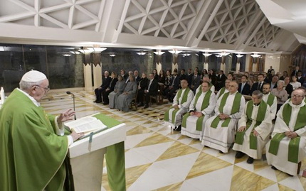 Komentējot pravieša Jonasa grāmatu, pāvests norādīja, ka tajā ir aprakstītas konfliktattiecības starp Dievu un Jonasu. Kungs paaicina pravieti un sūta viņu uz lielo pilsētu Ninīvi sludināt atgriešanos no grēkiem. Pirmo reizi Jonass nepaklausa un aiziet tālu no Dieva. Viņam šis uzdevums liekas pārāk smags. Kad Dievs vēršas pie pravieša otro reizi, viņš paklausa un dodas uz Ninīvi. Tā kā pilsētas iedzīvotāji ietic viņa vārdam un atgriežas, tad Dievs iežēlojas, maina savu lēmumu un nesūta tiem postu. Jonass, redzot, ka Dievs atceļ savus draudus, sadusmojas uz Viņu un vēršas pie Kunga ar pārmetumiem. "Kungs, vai tad ne to es sacīju, vēl būdams savā zemē? Šī iemesla dēļ es nolēmu bēgt uz Tarsu. Jo es zināju, ka Tu esi laipns un žēlīgs Dievs, augstsirdīgs un žēlsirdības pilns, un līdzjūtīgs nelaimē. Un tagad, Kungs, paņem, lūdzu, no manis manu dvēseli, jo labāka man ir nāve nekā dzīvība. Es vairs negribu ar tevi sadarboties. Labāk nomirt nekā turpināt ar tevi šo pravieša darbu, jo beigās tu tāpat izdari pretējo." Tas ir stāsts par stūrgalvi – turpināja pāvests. Stūrgalvīgais Jonass labi izdarīja savu darbu un tad aizgāja. Viņš dodas prom no pilsētas, uztaisa sev pajumti, sēž un gaida, kas notiks pilsētā. Jonass cerēja, ka Dievs iznīcinās pilsētu. Pa to laiku Dievs, Jonasam par prieku, liek izaugt efejai, bet efeja drīz vien iet bojā. Jonass atkal dusmojas uz Dievu. "Tu skumsti par krūmu, kuru neesi stādījis, nedz ko darījis, lai tas augtu, un kurš vienā naktī izauga un vienā naktī aizgāja bojā," saka Dievs, "bet Es – kā lai Es nepiedodu lielajai pilsētai Ninīvei, kurā ir vairāk nekā simt divdesmit tūkstoši cilvēku, kas neatšķir savu labo roku no kreisās, kā arī liels daudzums lopu?" Francisks norādīja, ka dialogs starp Dievu un Jonasu ir dialogs starp diviem stūrgalvjiem. Jonass stūrgalvīgi turas pie savas pārliecības, bet Kungs ir "stūrgalvīgs" savā žēlsirdībā. Kungs nekad mūs neatstāj, Viņš klauvē pie mūsu sirds durvīm līdz pēdējam brīdim, Viņš tur atrodas līdz galam – uzsvēra pāvests. Jonass bija stūrgalvīgs, jo savā ticībā izvirzīja nosacījumus. Viņš ir kristiešu, kuri izvirza priekšnoteikumus, modelis. "Es būšu kristietis, ja vien tas un tas notiks tā un šitā." Šādi kristieši kliedz: "Nē, taču, nē, tās pārmaiņas nav kristīgas pārmaiņas. Tā ir herēzija." Pāvests piebilda, ka tie ir kristieši, kuri iegrožo Dievu, iegrožo ticību un ierobežo Dieva darbību. Šādi kristieši baidās no pārmaiņām, no izaugsmes, no dzīves izaicinājumiem, no Kunga. Viņi noslēdzas savās idejās un nonāk līdz ideoloģijām. Viņi stūrgalvīgi turas pie savas pārliecības. Tas ir briesmīgi – atzina Svētais tēvs. Šādi kristieši ticības vietā izvēlas ideoloģiju un attālinās no kopienas. Viņi baidās ielikt sevi Dieva rokās. Viņi ar savu šauro domāšanu jeb savu mazo sirdi visu kritizē. Noslēgumā pāvests norādīja uz diviem Baznīcas tēliem. No vienas puses, mums ir darīšana ar ideologu Baznīcu, kuri "tup" savās ideoloģijās, bet, no otras puses – ar Baznīcu, kas atklāj pasaulei Kungu, kurš tuvojas visam un kuram nekas, kas ir cilvēcisks, nav riebīgs, kuru nekas nespēj atgrūst. "Viņu neatgrūž pat mūsu grēki," teica Francisks. Viņš mums tuvojas kā tas, kurš tuvojas lepras slimajiem, lai tos apskautu un samīļotu, tāpēc ka Viņš ir nācis, lai dziedinātu, Viņš ir nācis, lai glābtu, nevis tiesātu. Vaticannews.va |