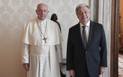 Audiences laikā Francisks un A. Gutērešs ierakstīja video vēstījumu. Tajā teikts, ka svarīgā tikšanās norisinās īsi pirms Kristus dzimšanas svētkiem, kad savas acis paceļam uz debesīm, lai uzticētu Dievam cilvēkus un dzīves situācijas. Šajā skatienā ieraugām, ka mēs visi esam viena Dieva bērni, mēs visi esam brāļi. ANO ģenerālsekretārs un pāvests pateicās par sniegto ieguldījumu brālīgākas un taisnīgākas sabiedrības veidošanā. “Mēs labi zinām, ka paši ar saviem spēkiem nespējam paši sevi atpestī un pasargāt”, sacīja Francisks un Gutērešs. Viņi uzsvēra, ka neviens nevar palikt vienaldzīgs dažādu netaisnību, vardarbības, bada un nabadzības priekšā. Mēs nevaram mierīgi stāvēt malā, redzot, kā lēnām mirst mūsu brāļi, kuriem trūkst ūdens, pārtikas un minimālās veselības aprūpes. “Mēs nevaram aizvērt acis pret savu vismazāko brāļu ļaunprātīgu izmantošanu. Mums visiem kopā ir jācīnās pret šo postu. Tāpat mēs nevaram aizvērt acis pret cilvēkiem, kuri kara, konfliktu, vardarbības, nabadzības un klimata pārmaiņu dēļ spiesti pamest savas valstis. Mēs nevaram palikt vienaldzīgi pret situācijām, kad tiek mīdīta cilvēka personas cieņa un pārkāptas viņa tiesības; kad tiek veikti uzbrukumi pret cilvēka dzīvību, apraudot to gan mātes klēpī, gan vecumā. Mēs nedrīkstam pagriezt muguru laikā, kad vairākās pasaules malās tiek vajāti dažādu reliģiju sekotāji. Naida, vardarbības, ekstrēmisma un akla fanātisma kurināšana reliģijas vārdā smagi apvaino Dievu un pazemo cilvēku.” Vēstījumā pāvests Francisks un ANO ģenerālsekretārs pauda vienprātību attiecībā uz brunošanos aizliegšanu. Viņi ir pret kodolieroču ražošanu, pārdošanu un uzglabāšanu, uzskatot to par amorālu rīcību. Puses aicināja atmest vienaldzību pret pasaulē notiekošajiem kariem, īpaši aizmirstajiem konfliktiem. Šodien ir nepieciešams veicināt mieru, konstruktīvu dialogu un integrālas ekoloģijas attīstību. Vaticannews.va Foto: Vatican Media |