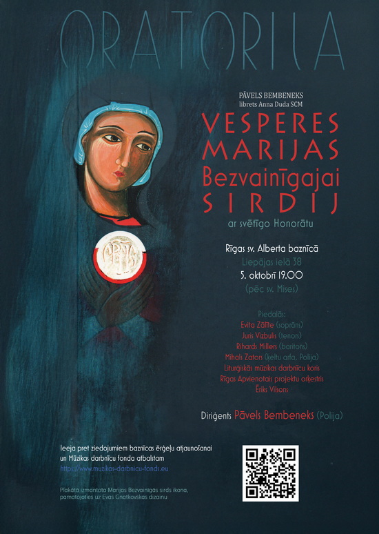 Tevi vadīs svētīgā tēva Honorāta Kozmiņska - kapucīna - vārdi, Pāvela Bembeneka - liturģiskās mūzikas komponista - mūzika un Bezvainīgās Marijas Sirds ikona, ko radījis Vojcehs Koričiņskis. Tev līdzās būs arī Bezvainīgās Vissvētākās Jaunavas Marijas Māsas kalpones un Mazāko brāļu kapucīnu ordeņa Latvijā brāļi, kas aicina smelties no sava garīgā ceļa avotiem, kā arī rūpējas par šīs oratorijas dalībniekiem. Libretu sagatavojusi māsa Anna Duda SCM, tekstu latviešu valodā tulkojusi un adaptējusi Kristīne Locika, bet svētīgā tēva Honorāta apceres tulkojusi Marika Lotaņuka CSSBVMI. Oratorijas grafiskās atpazīšanas zīme ir Marijas Bezvainīgās Sirds ikona, ko radījis Vojčehs Koričiņskis, bet dizainā ietērpusi Eva Gnatkovska. Pirmatskaņojums notiks svētdien, 5. oktobrī plkst. 19.00 (pēc sv. Mises) Rīgas Sv. Alberta baznīcā. Oratorijā piedalās: – Evita Zālīte (soprāns) – Juris Vizbulis (tenors) – Rihards Millers (baritons) – Mihals Zators (ķeltu arfa, Polija) – Liturģiskās mūzikas darbnīcu koris – Rīgas Apvienotais projektu orķestris (vadītājs Henrijs Kalniņš) Apceres lasīs aktieris Ēriks Vilsons. Diriģents – komponists Pāvels Bembeneks (Polija). Koncerts top kā Mūzikas darbnīcu fonda un Rīgas Sv. Alberta baznīcas sadarbības projekts. Tā īstenošana balstās uz dalībnieku brīvprātīgu darbu, ziedojumiem un ticību mūzikai kā lūgšanai. Ieeja koncertā – par ziedojumiem Sv. Alberta baznīcas ērģeļu atjaunošanai, kā arī Mūzikas darbnīcu fonda atbalstam. Kristīne Locika, projekta koordinatore www.muzikas-darbnicu-fonds.eu
